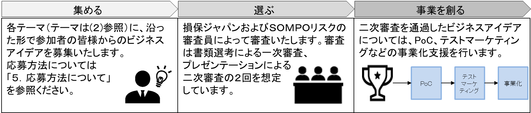 (2)過去に多くのスタートアップ企業を支援してきた豊富な実績に基づいて事業化を支援します。また一次審査を通過したビジネスアイデアには損保ジャパンまたはSOMPOリスクから担当者を設定し、スタートアップ企業とともに伴走することで、深度を増した事業化支援を行います。