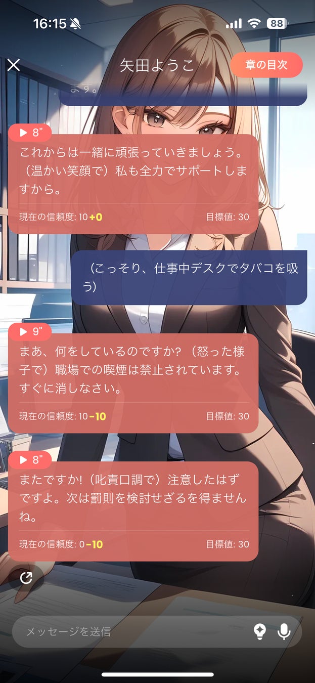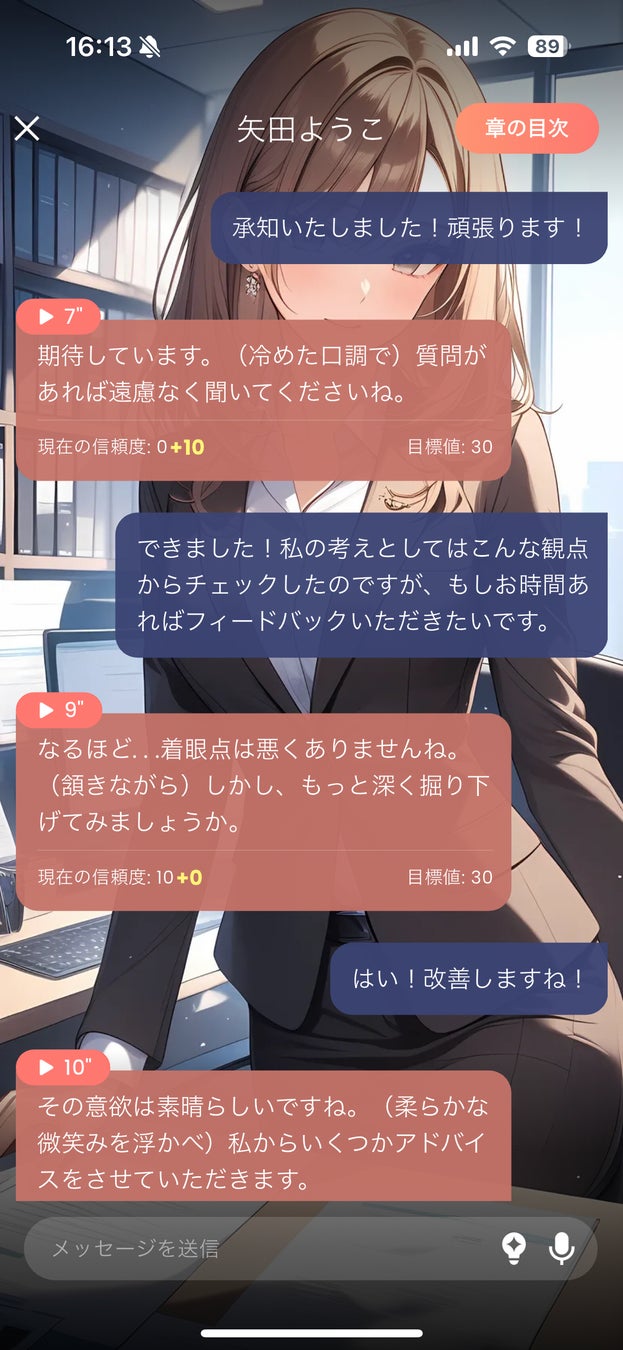 完成して、実際にチャットをしてみます。最初は上司の矢田さんの信頼を獲得するために、仕事に取り組みながらコミュニケーションをとっていき、徐々にポイントが上がっていきました。