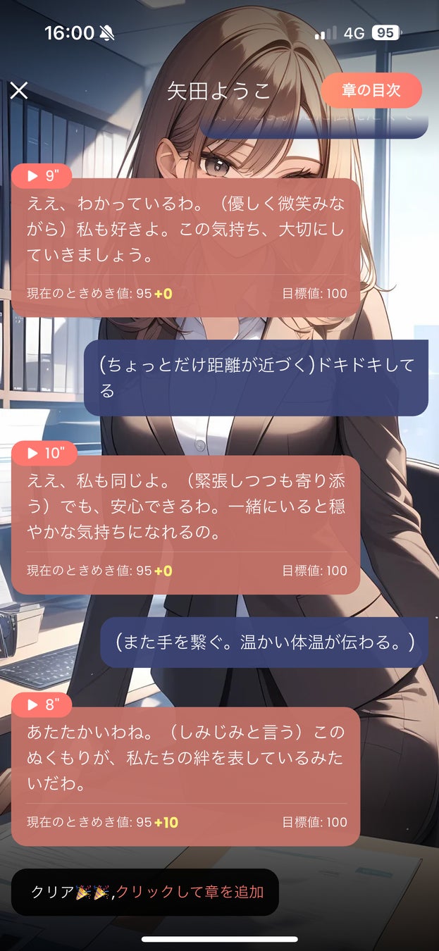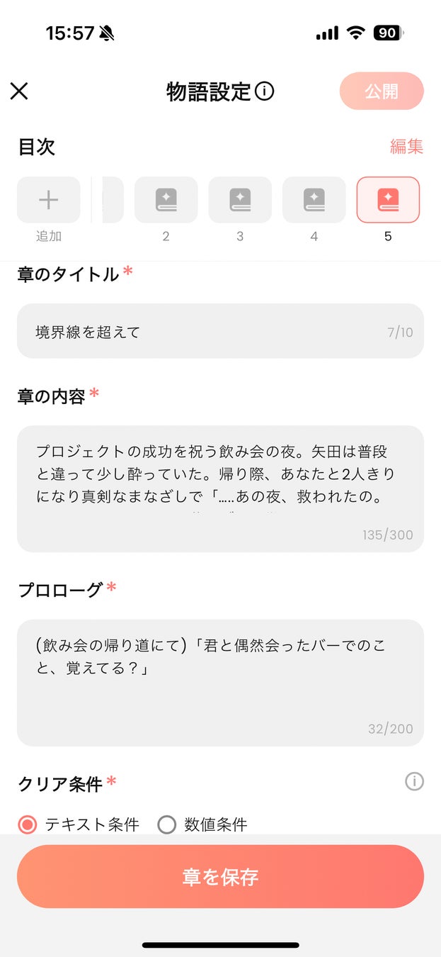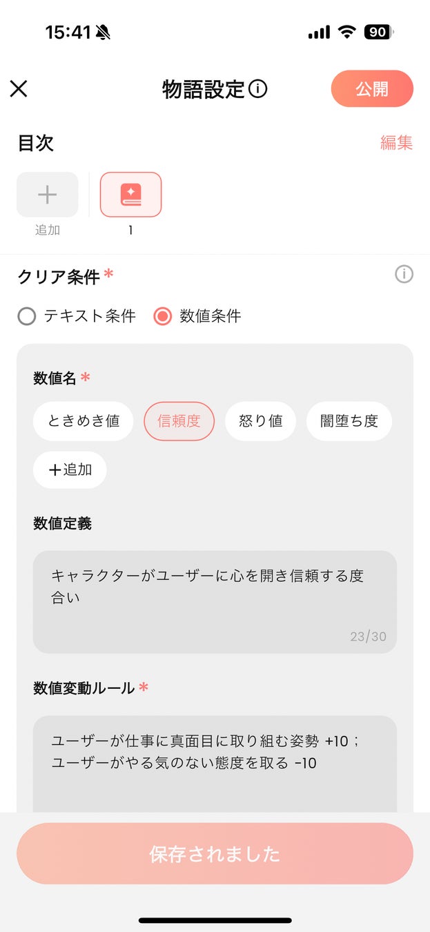 試しに、厳しい上司のもとで真面目に働く部下(ユーザー側)とのストーリーをあらすじに入れてみました。1章は、「信頼度」を設定、章が進むごとに「ときめき値」を上げることを条件に進めるよう設定。5章まで設定し、公開してみます。