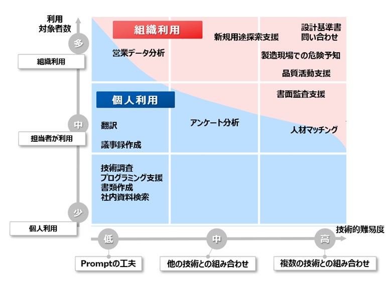 個人の業務利用においては、各従業員が既存の生成AIツールを使いこなすスキルを身に着けることが重要です。一方、各組織の業務に特化した用途では、そうしたスキルに加えて、ソフトウェアやITなどの技術・知識が必要となります。そのため、当社では個人利用と組織利用の両面で、生成AIの活用を支援しています。