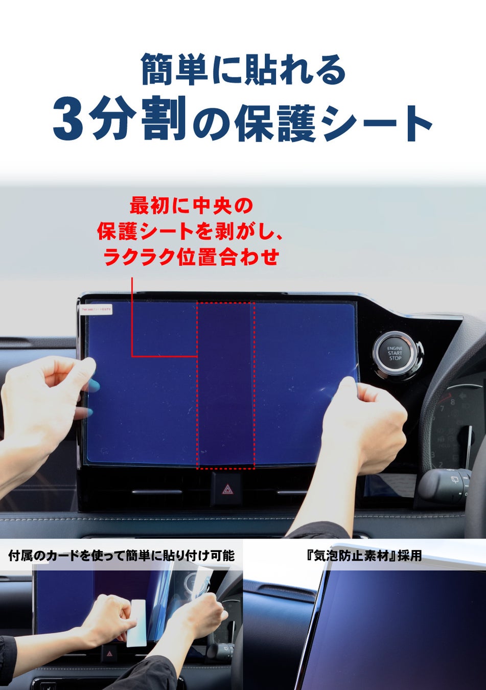 保護シートを「3分割」にすることにより、大きなナビ画面でも位置合わせがしやすく、簡単に貼り付けが可能です。また、フィルムの粘着面には特殊シリコン素材を採用。これによりフィルムは自己吸着し、気泡は入りづらく抜けやすくなります。