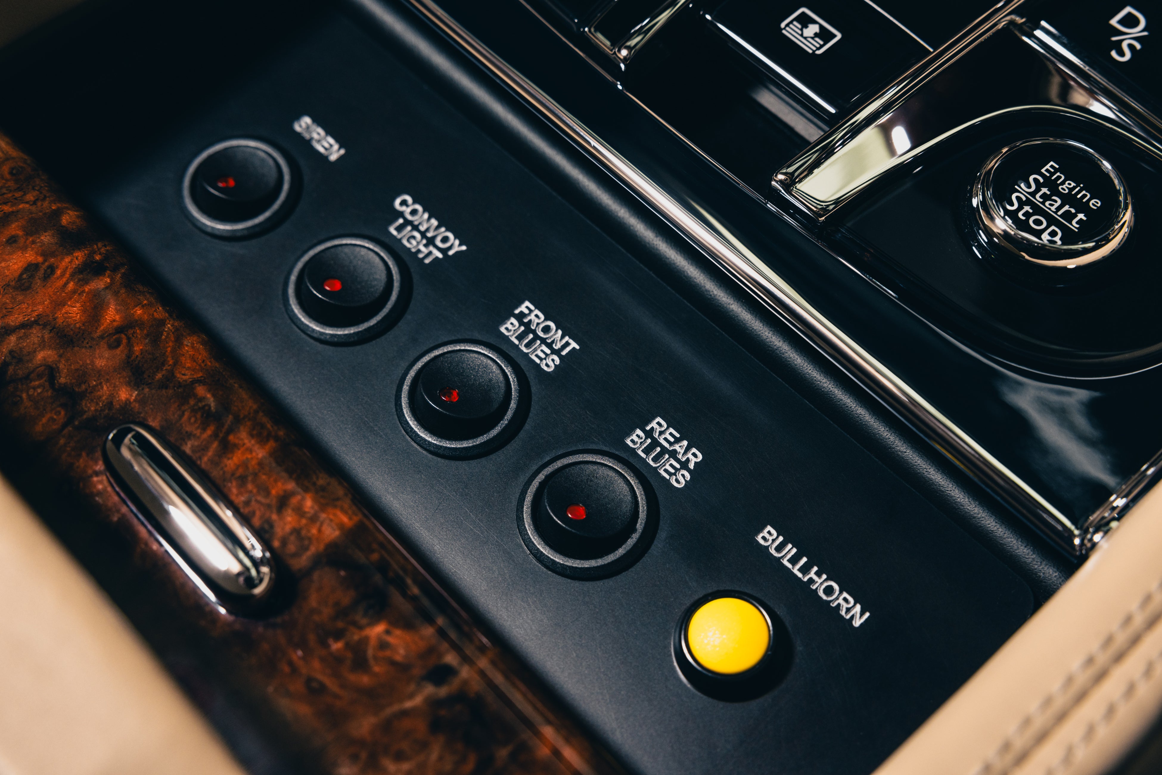 ブルーの前後のパトライト、サイレン、拡声器も設置され、ギアレバーの後ろにあるウォールナット仕上げのドアの下に目立たないように専用のスイッチパネルが隠されています。