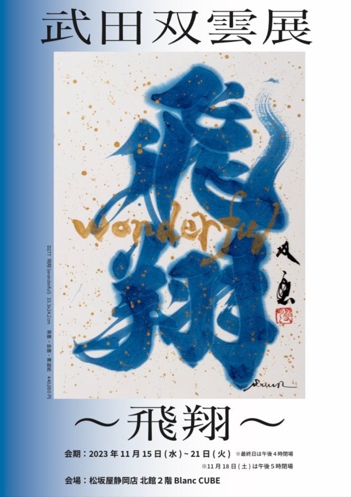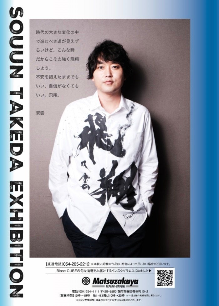 同時期に松坂屋静岡店 北館2階 アート&ラグジュアリーサロンBlanc CUBEでは「武田双雲展〜飛翔〜」を開催いたします。武田双雲先生の作品が一堂に会すだけでなく、作家ご本人も在廊なさる貴重な機会です。