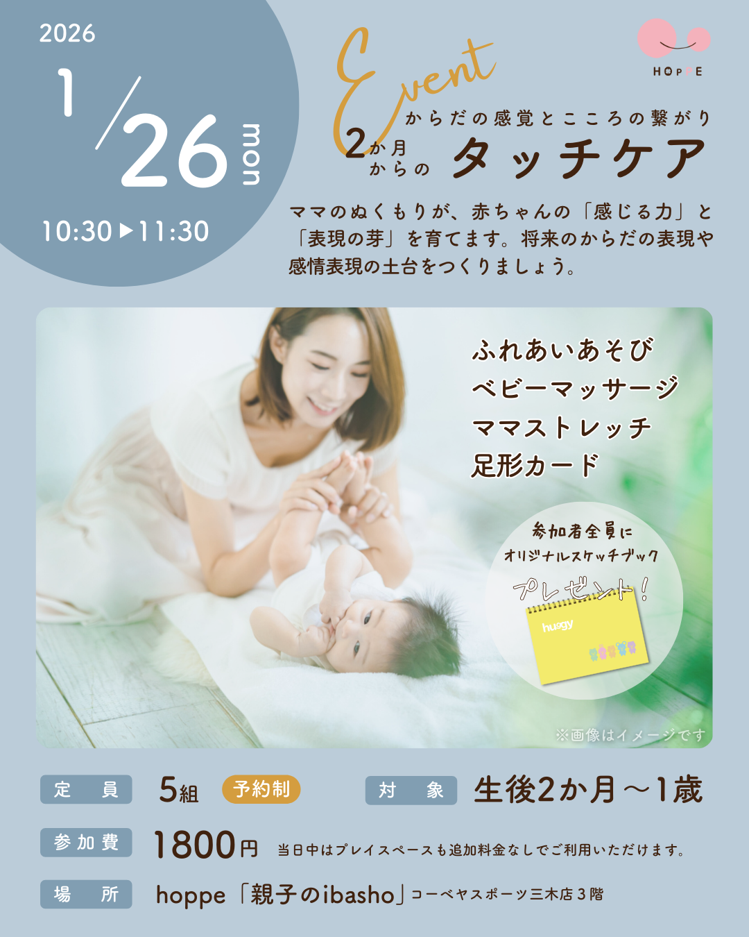 特定非営利活動法人ほっぺ(兵庫県三木市・代表:大森 奈津子)は親子向けイベントとして、2026年1月26日(月)にhoppe(コーベヤスポーツ三木店3階)にて、ふれあいあそびやベビーマッサージ体験ができる「2か月からのタッチケア~からだの感覚とこころの繋がり~」を開催いたします。