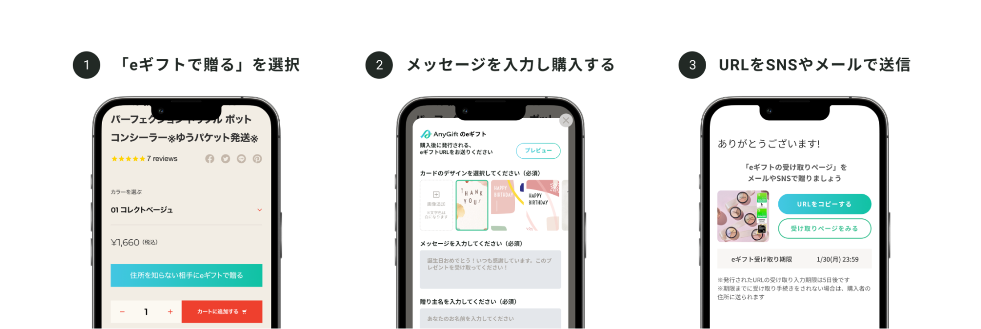 1)商品ページで「住所を知らない相手にeギフトで贈る」を選択するとeギフトをご利用いただけます。