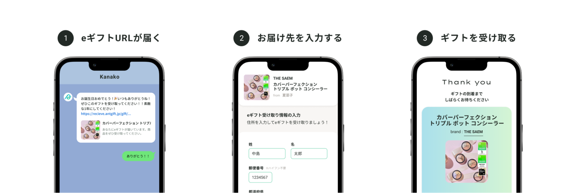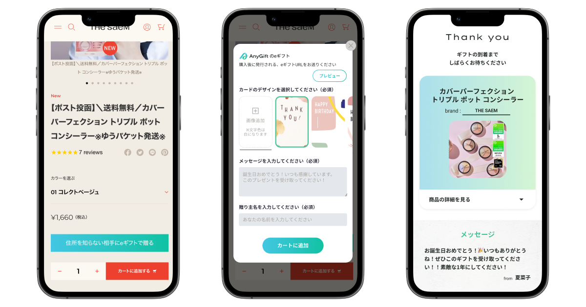 いつもお世話になっている方へのちょっとしたプレゼントや、大事な人への誕生日や記念日、サプライズをしたいときなど、相手の住所を知らなくても気軽に「THE SAEM」をギフトとして贈ることが可能です。URLはご注文後すぐに発行されるので、すぐに贈ることができます。