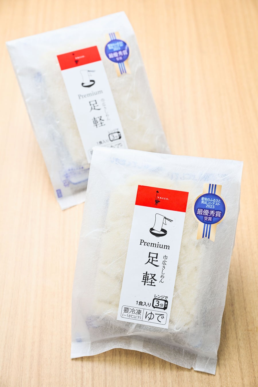 「足軽premium」は、愛知県西尾市産のブランド小麦と塩だけで作った巾広きしめん。農家で構成する西三河農協農作業受託部会と、JA西三河がブランド化を進めている「にしお小麦」の中で、栽培期間中に除草剤を使わずに育てた「きぬあかりpremium」を、100%使用しています。加工でんぷんなどの添加物も不使用。電子レンジで3分加熱するだけでゆでる必要がない手軽さと、もちもちした食感とツルツルとしたのど越しの良さが魅力です。