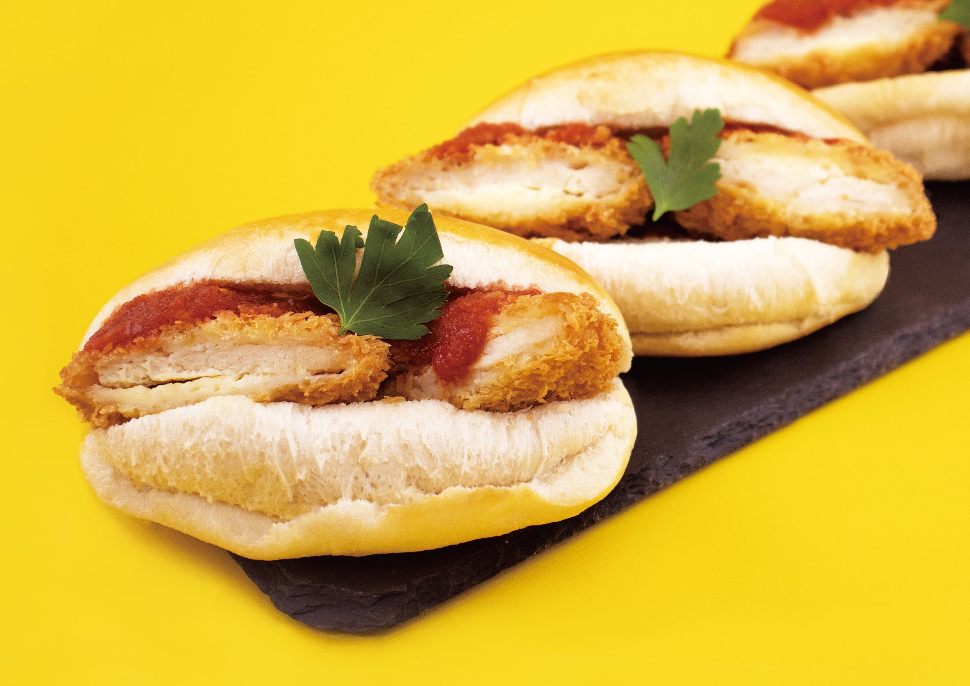 チーズインチキンカツとガーリックトマトをサンドしました。にんにくの効いたトマトソースが、ジューシーなチキンを引き立てます。