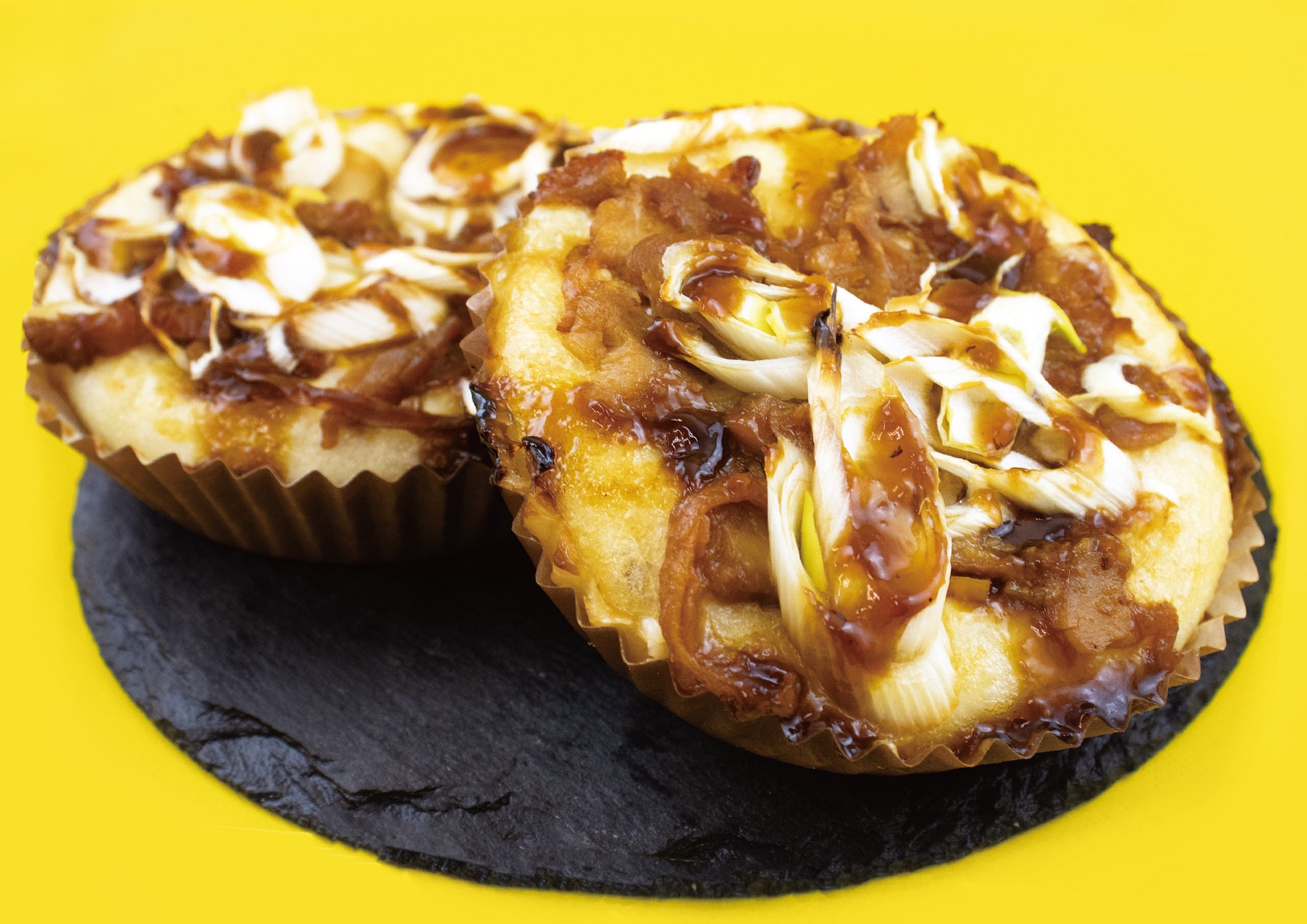 北海道産小麦を使用したバンズ生地に焼き込みマヨ、テリヤキチキン、白ネギをトッピングして焼き上げました。甘辛く味付けされたチキンと白ネギが食欲をそそります。