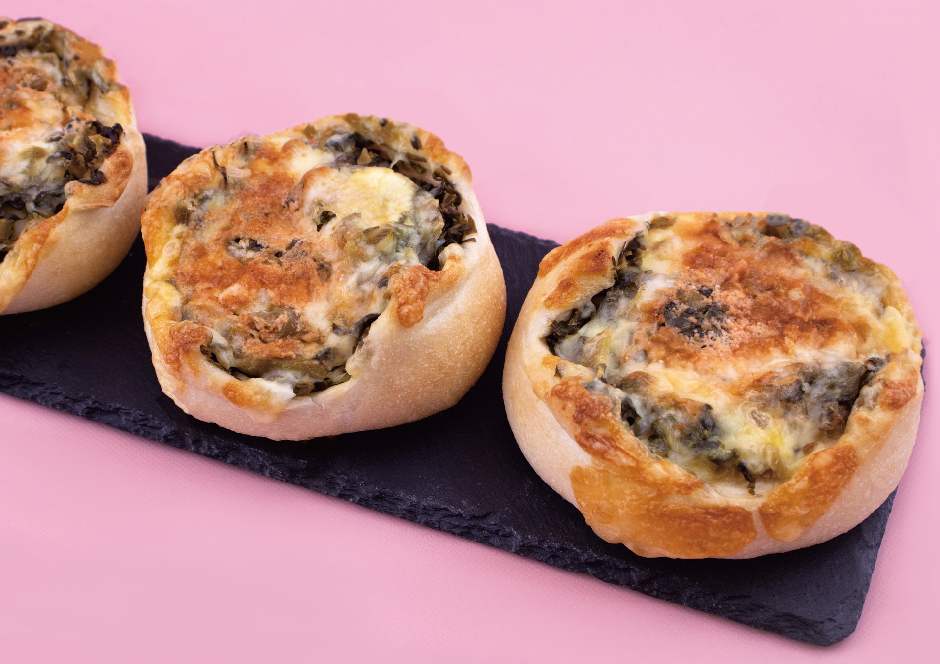 高菜とチーズクリームを包餡し、明太子フィリングをトッピングしました。高菜と明太子の旨味がたっぷり詰まったおかずパンです。
