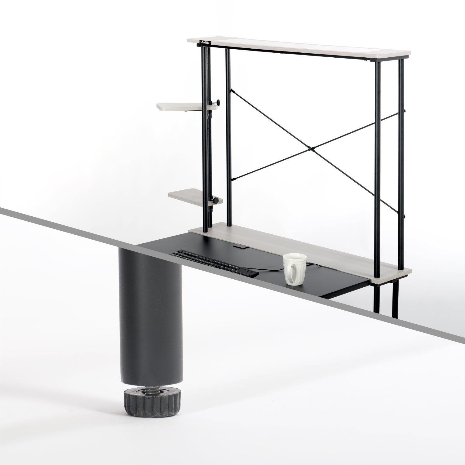 今つかっている机にクランプで連結するだけの簡単設置で、下段は天板の奥行き拡張に、上段は猫のくつろぎスペースに。面倒なDIYや家具の買い替え不要で、あなたの作業スペースを「猫デスク」化することが可能です。高いところが大好き&飼い主を常に監視していたい猫も満足、ネコハラされてもいいから常に近くに猫がいてほしい&かわいい肉球を堪能したい飼い主も満足...な、互いが幸せになれるデスク環境を手軽に構築できます。設置に場所をとらず、また机と連結することで土台の接地面積を広く確保し、省スペース性と安定性を両立している点もうれしいポイントです。