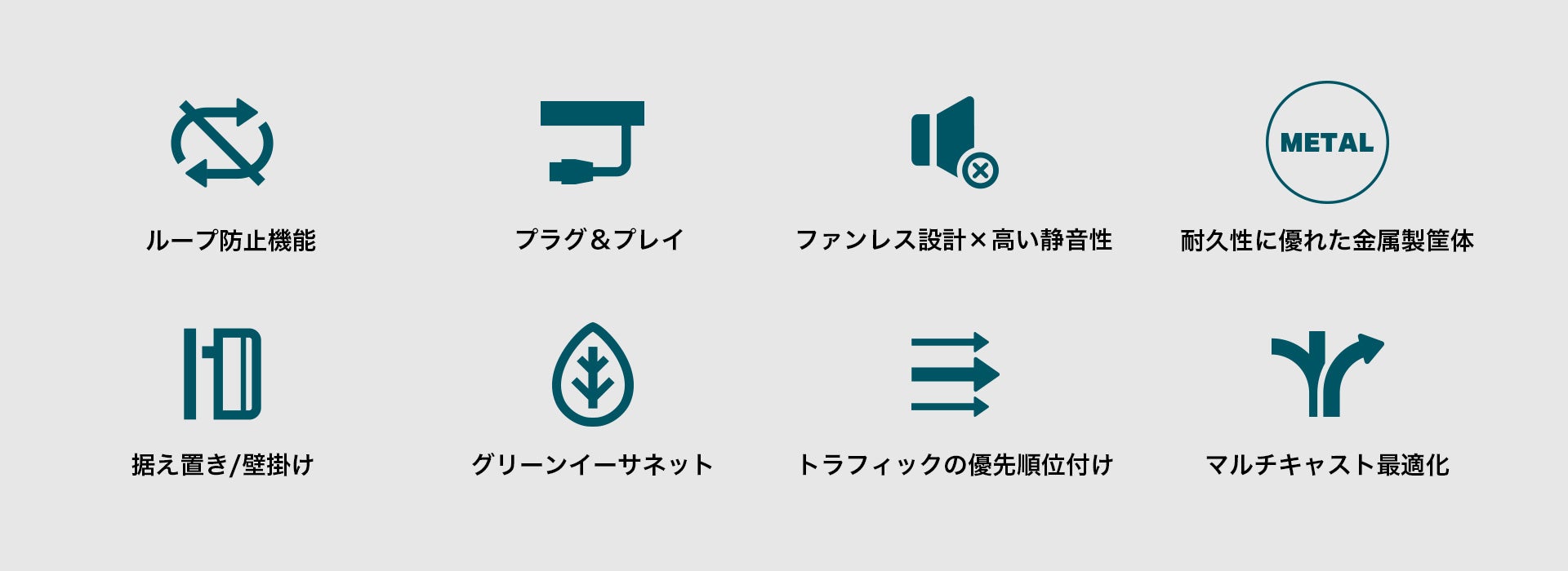 「TL-SG605」「TL-SG608」は、10/100/1000Mbpsに対応したオートネゴシエーション機能付きRJ45ポートをそれぞれ5ポート・8ポート搭載し、Auto-MDI/MDIXに対応することでネットワーク接続を簡素化します。ネットワークループ防止スイッチを備え、トラブルを監視・回避する機能を搭載。さらに、802.1p/DSCP QoSやIGMPスヌーピングにも対応しており、高品質で効率的な通信を実現します。耐久性の高い金属製筐体、静音性を確保するファンレス設計、据え置き・壁掛けの柔軟な設置が可能で、さまざまな利用シーンに対応。IEEE 802.3xフロー制御による安定したデータ転送や、グリーンイーサネット技術による省エネ性能も特徴です。プラグ&プレイで手間のかかる設定を必要とせず、手軽に高性能ネットワークを構築できます。
