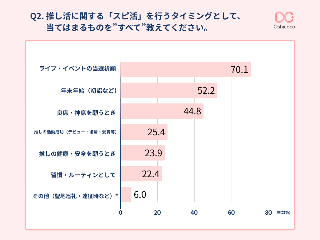 「初詣」という季節行事以上に、チケットの当落や座席運という「現場」に直結するタイミングが最大の動機となっています。また、「習慣・ルーティン」として「スピ活」を行う推し活層も全体の22%、つまり5人に1人以上いることから、普段の推し活に「スピ活」という行動が、入り込んでいるということが読み取れます。