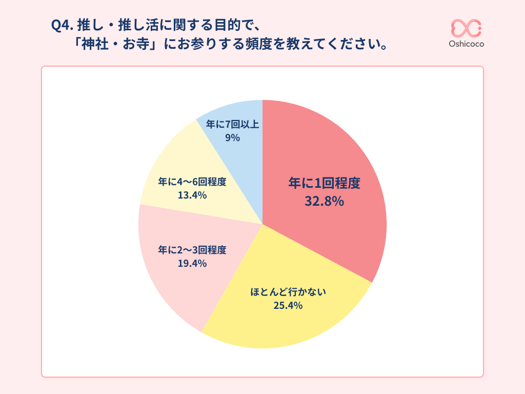 推し活目的での参拝頻度は、「年に1回程度(32.8%)」がもっとも多い結果となりました。次いで「ほとんど行かない(25.4%)」という回答が続いており、全体の半数以上が日常的な参拝ではなく、特定のタイミングに限定して行動していることがわかります。