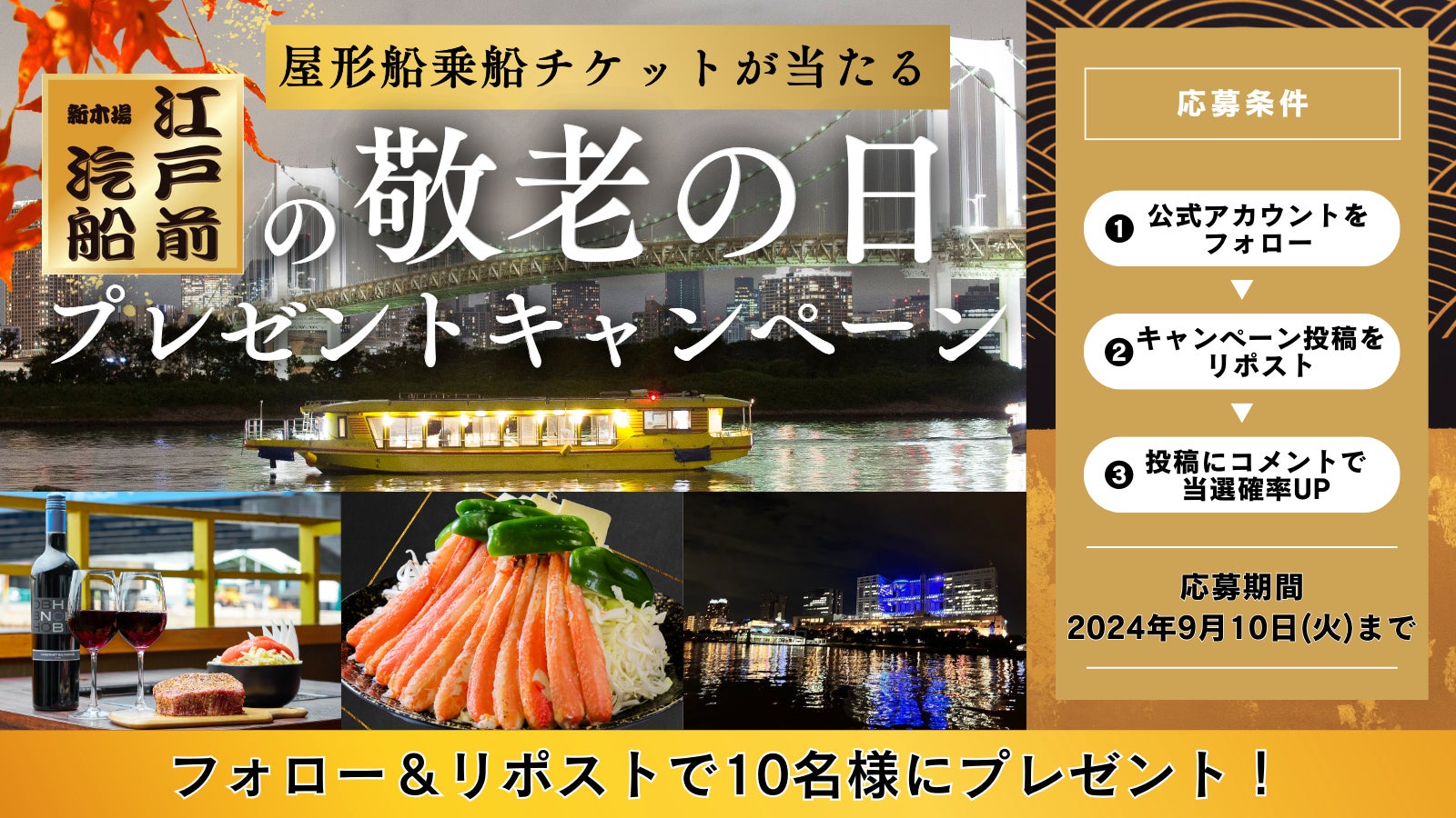 浜友グループの江戸前汽船株式会社(本社:東京都江東区、代表取締役:後藤武彦)は、屋形船に乗船できるペアギフトチケットや最大20%OFFの割引券が当たる、SNSでのプレゼントキャンペーンを9月3日(火)より開始することをお知らせいたします。