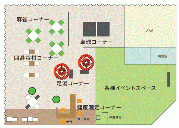 今回のイベントでは、お土産付き健康イベントとして推定野菜摂取量測定会「ベジチェック」やファンケルによる「骨健康度チェック」のほか、地域ボランティアによるギター演奏会、お気軽さいほう体験、また、お楽しみビンゴ大会を企画しております。 このほか、おとな・Reでは麻雀や囲碁将棋、卓球や足湯コーナーなども無料でご利用いただけます。