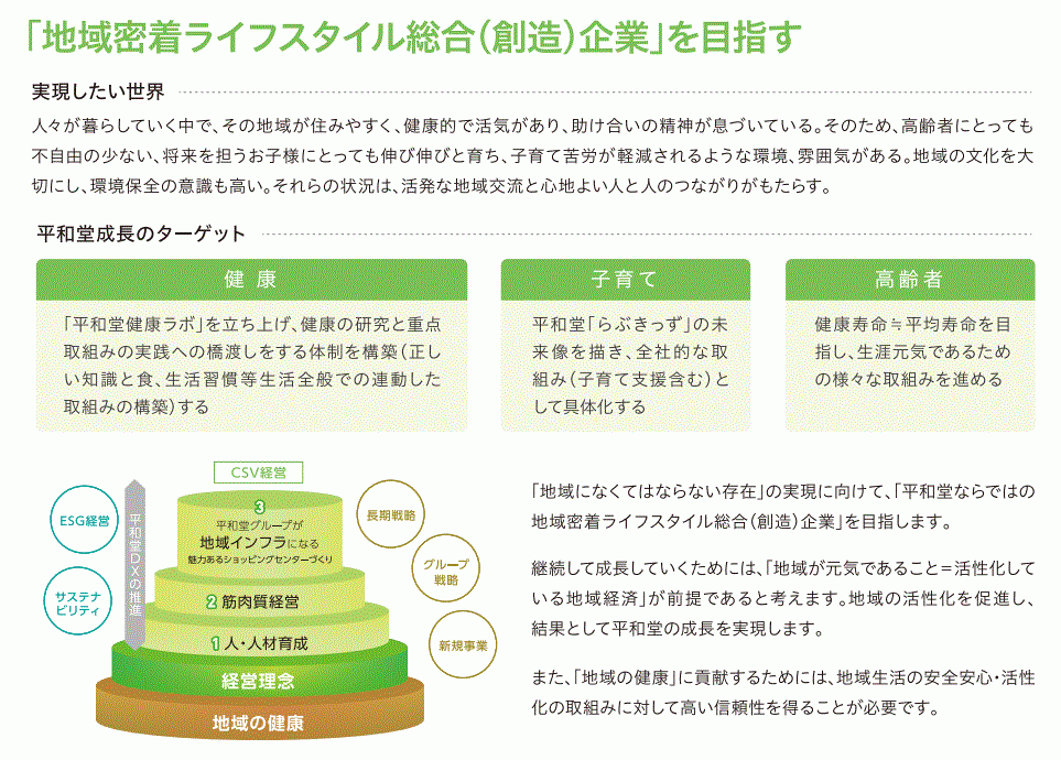 平和堂は、企業理念として「お客様と地域社会に貢献し続ける企業」を掲げており、「地域密着ライフスタイル総合(創造)企業」を目指しています。これは、地域の抱える課題について地域と一緒に取り組むことで、明るく元気で、健康な地域を創っていくという「地域共創」が根幹であり、地域の持続的な成⾧に貢献し、地域経済が活性化し、社会がより良くなっていく「地域の健康」が、平和堂の成⾧と理念の実現に繋がると考えています。