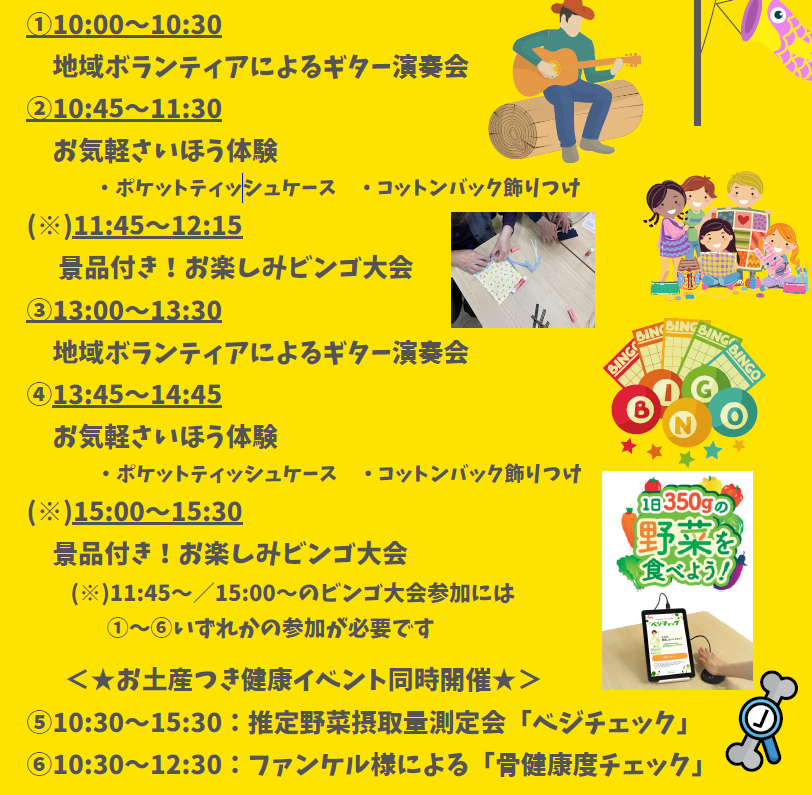 ⑦11:45~12:15、15:00~15:30 上記①~⑥に参加いただいた方の限定企画!景品付き!お楽しみビンゴ大会