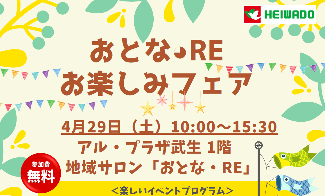 【平和堂】アル・プラザ武生 2023年4月29日(土) 地域サロン「おとな・Re」お楽しみフェア開催