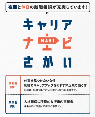 堺市では、短時間就労など多様な働き方を希望する女性への就職支援や非正規雇用で働いている方の転職支援、市内事業者の人材確保を支援する「キャリアナビさかい」を開始します。