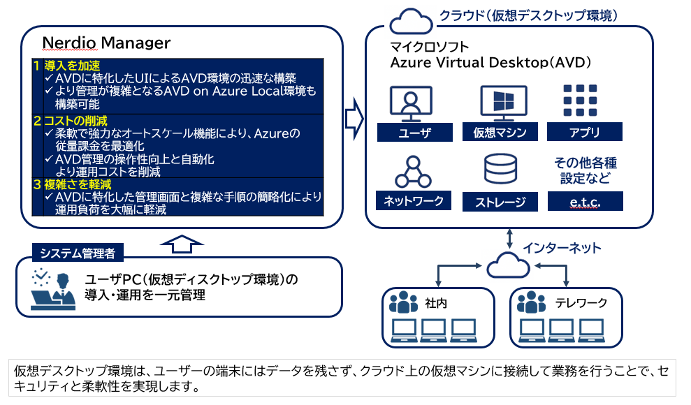 Nerdio Managerは、マイクロソフトのAzure上で稼働し、AVD環境(Azure Local上のAVDを含む)を効率的に管理します。本ソリューションを導入することで、環境構築に加え、日常的な運用を簡略化します。本ソリューションの主な特徴は、以下の通りです。