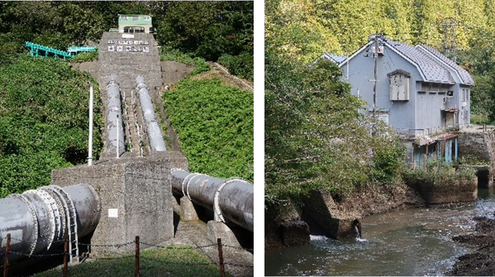 ・末沢発電所では、自然に囲まれた風景とともに発電のために水圧鉄管内を流れるダムの水流を間近に