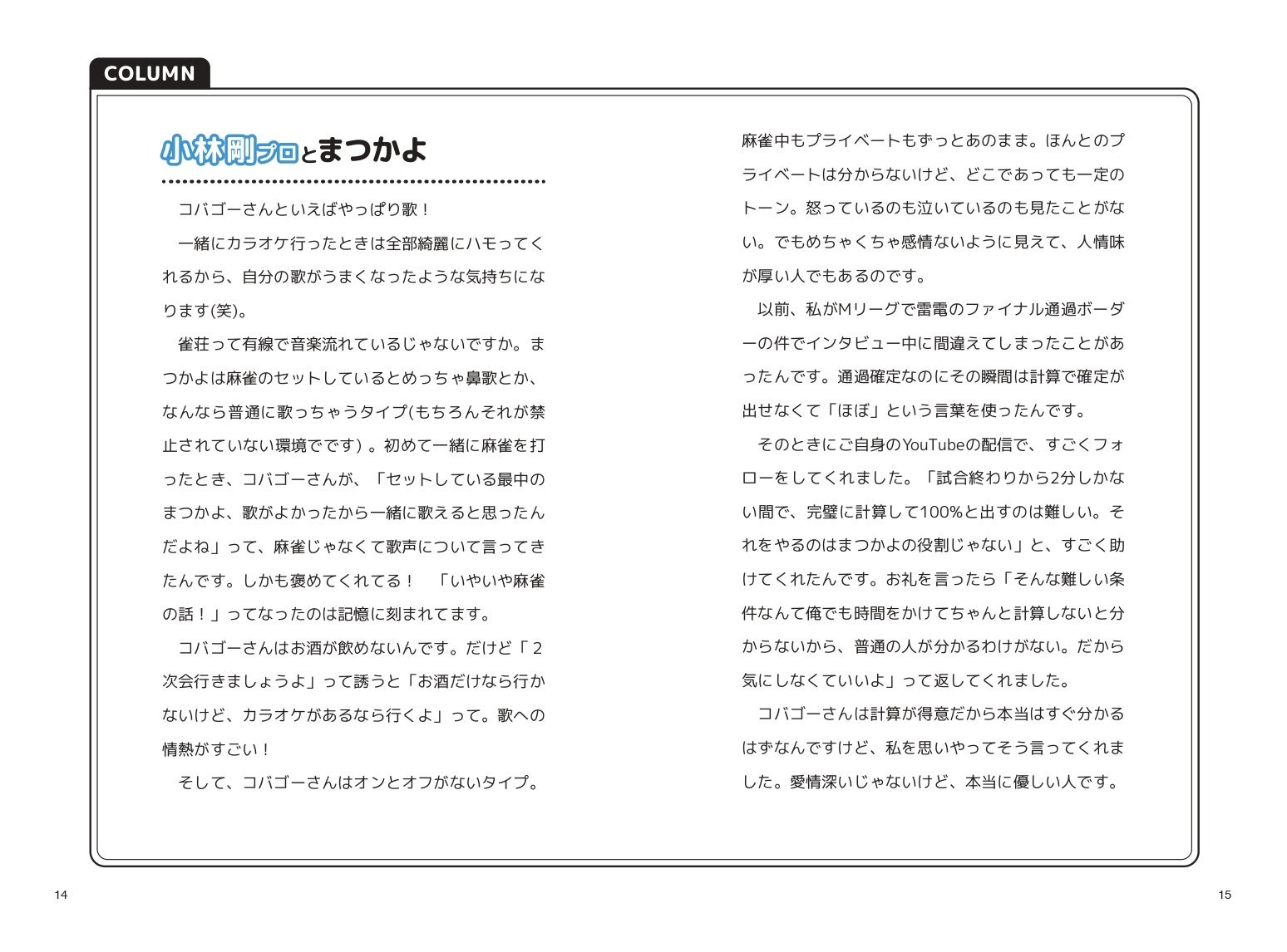 Mリーガーとの対話形式で戦術を学べる戦術パートと、選手の一面を紹介するエッセイパート、巻末には麻雀用語解説も付属し見る雀専門の方から上級者まで楽しめる構成になっている。