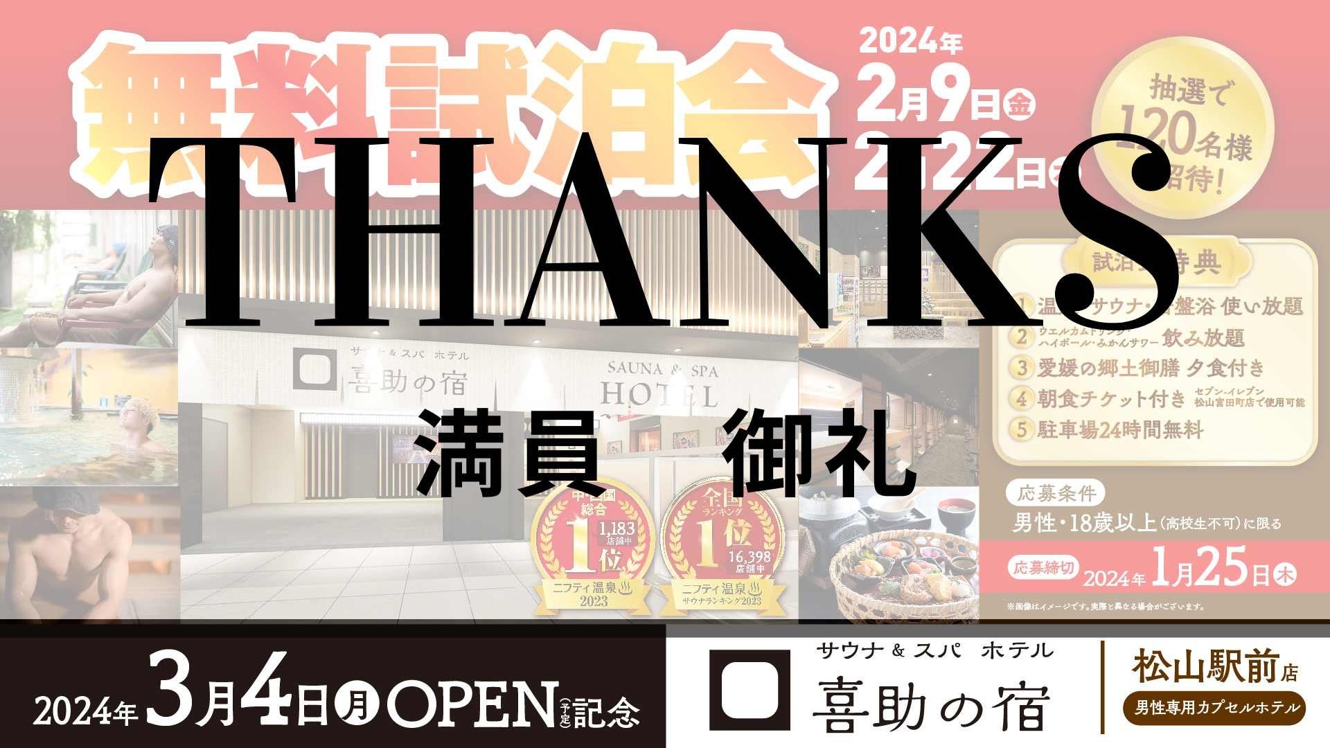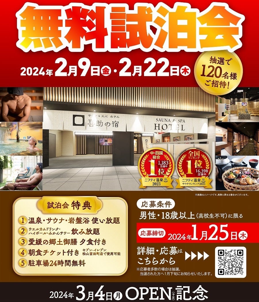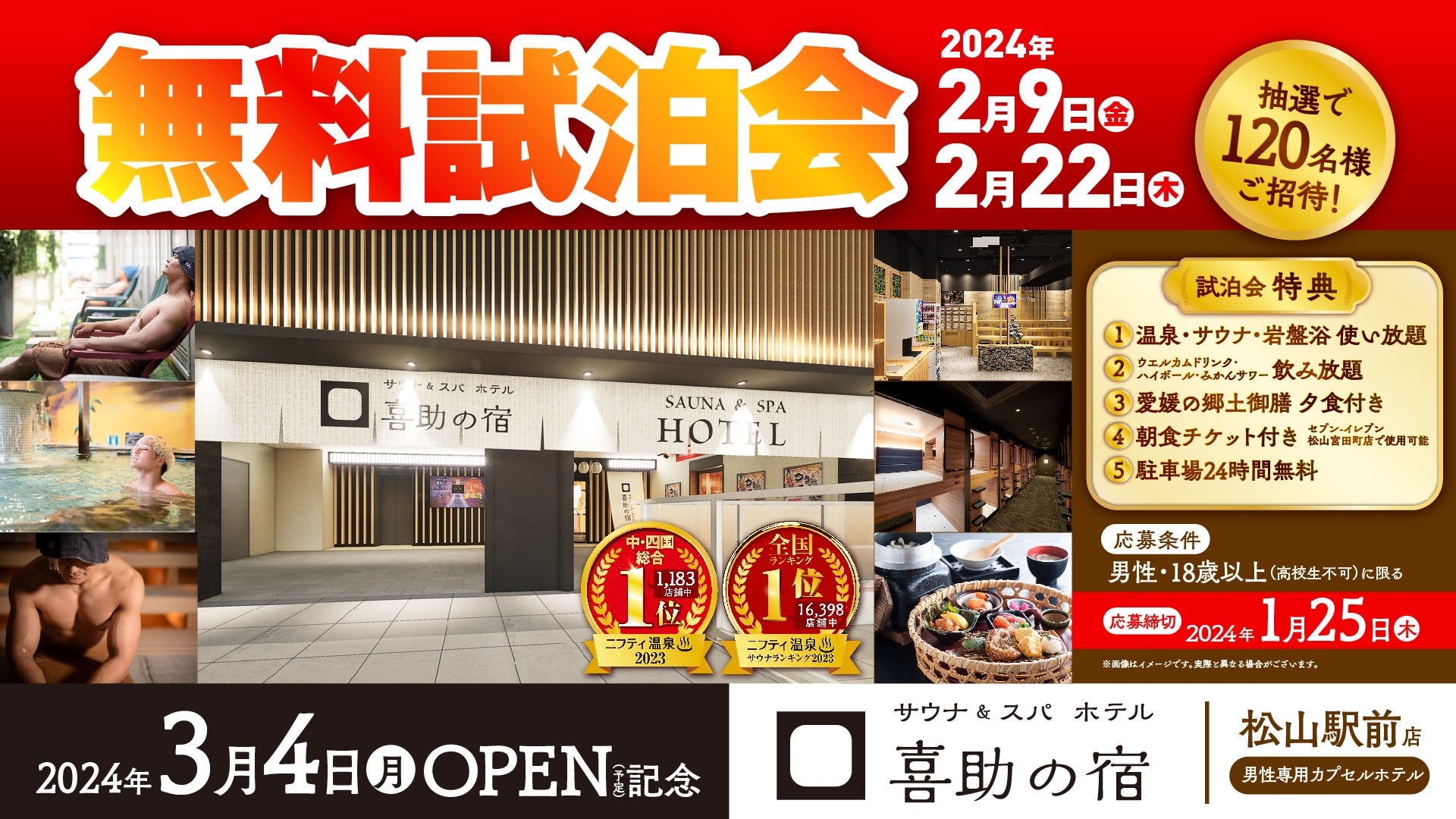 このたびは、サウナ&スパ・ホテル 喜助の宿 試泊会への多くのご応募、誠にありがとうございました。