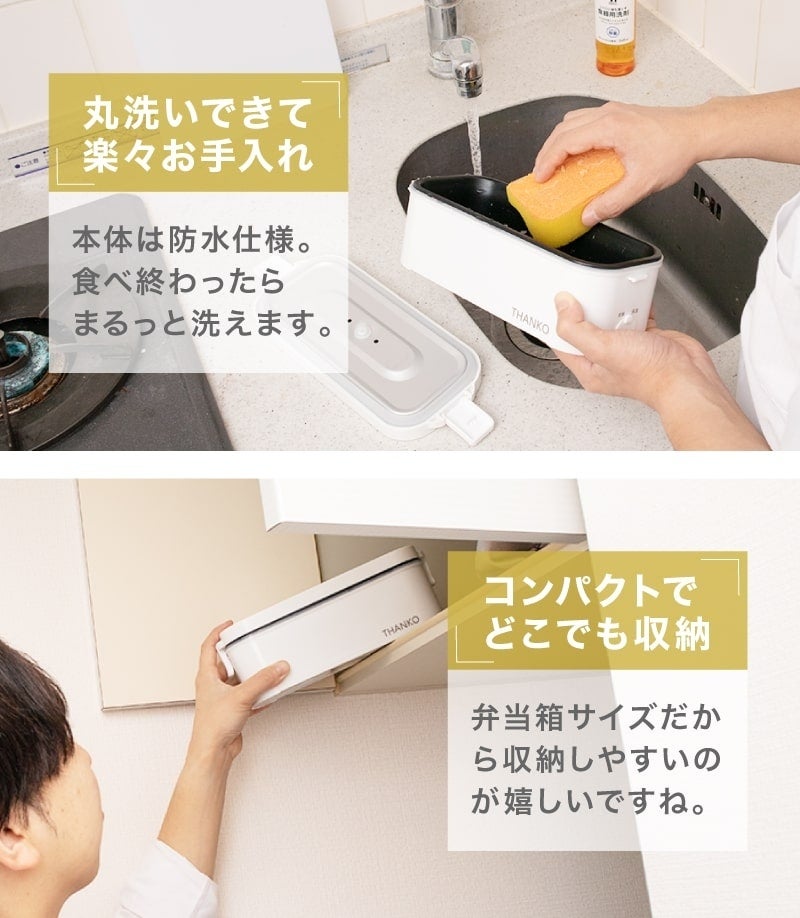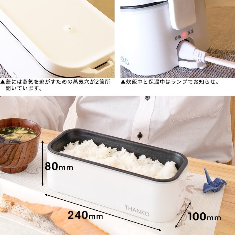面だけでなく側面もしっかりと加熱することにより高速炊飯を実現。特別なお米を使うことなく、0.5合炊飯時14分。1合炊飯時19分で炊き上げることが可能。いつでも炊きたてのご飯を味わうことが出来ます。本体は丸洗いが可能で炊飯後、茶碗に移さずにそのままお召し上がれます。本体サイズは幅240×奥行き100×高さ80mm、重さ740gで気軽に持ち運べ、リビングでも自分の部屋でも職場でも好きな所でお使いいただけます。
