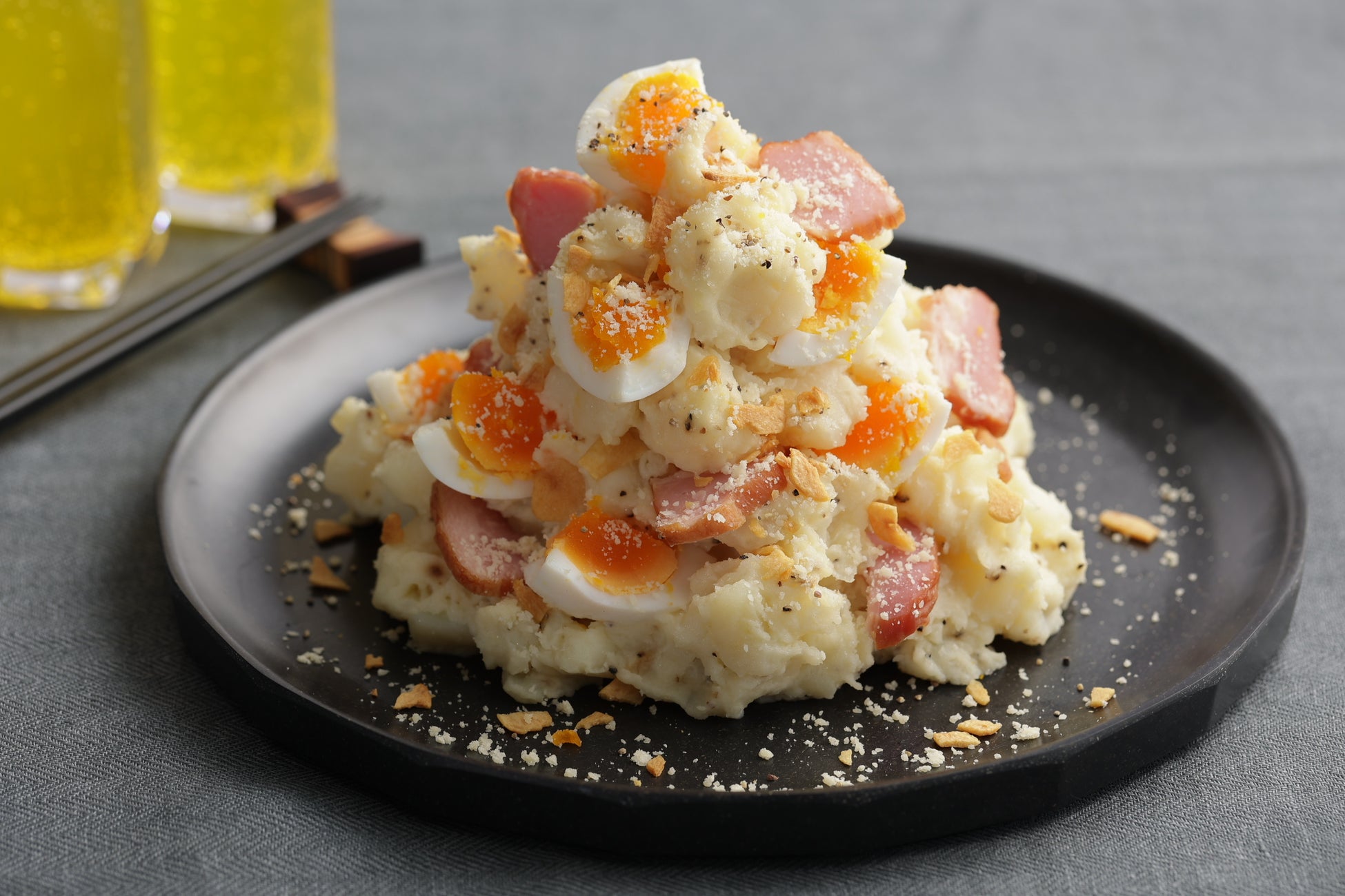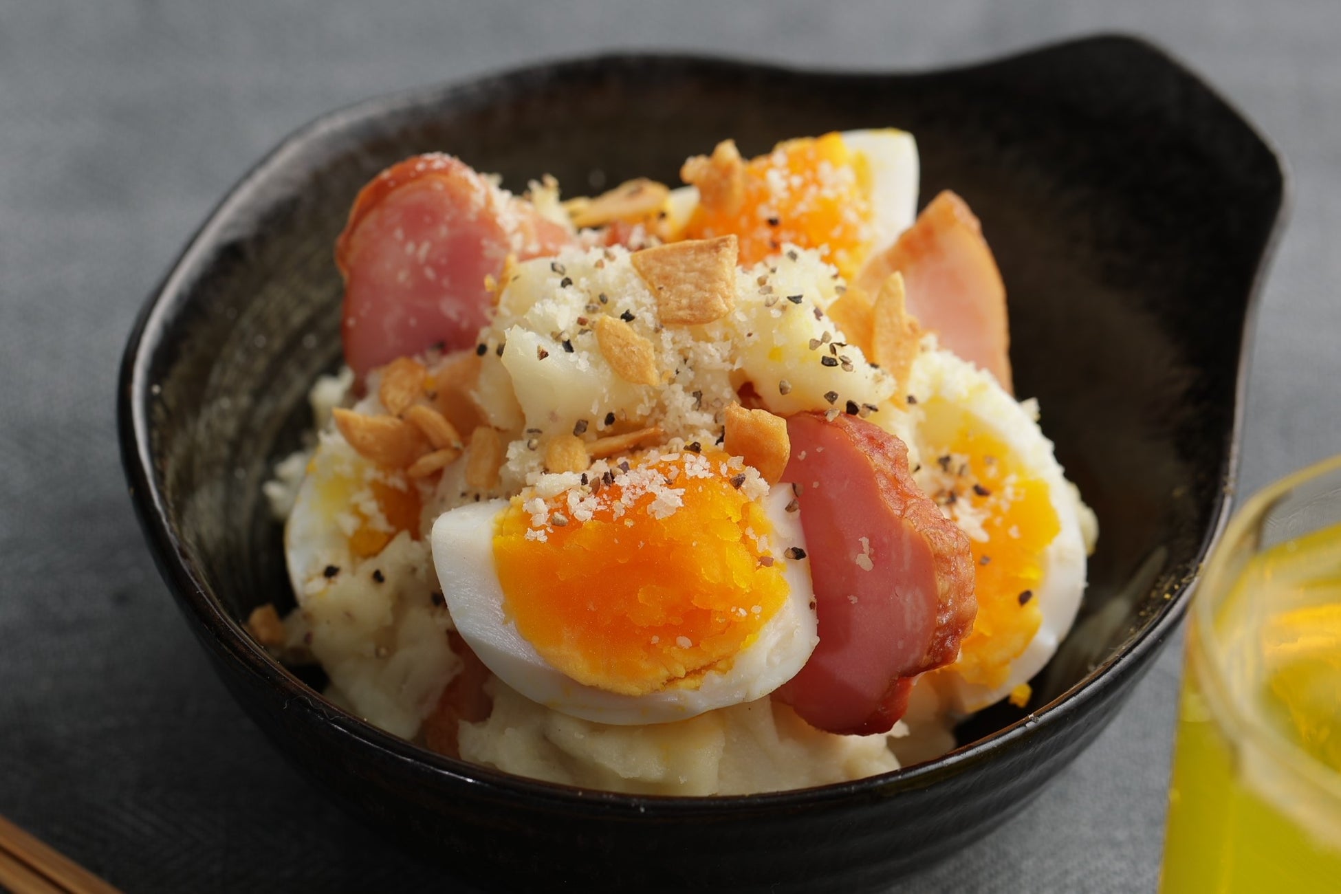 じゃがいもの風味をいかしたシンプルなポテトサラダをベースに、チーズの香りと旨味、スパイシーな黒胡椒で味付けし、半熟ゆで卵とベーコンを立体的に盛り付けました。さらに最後の仕上げにも粉チーズと黒胡椒をふりかけ、関西の店舗ではカリッとした食感と香ばしい味わいのフライドオニオンもプラスしました。