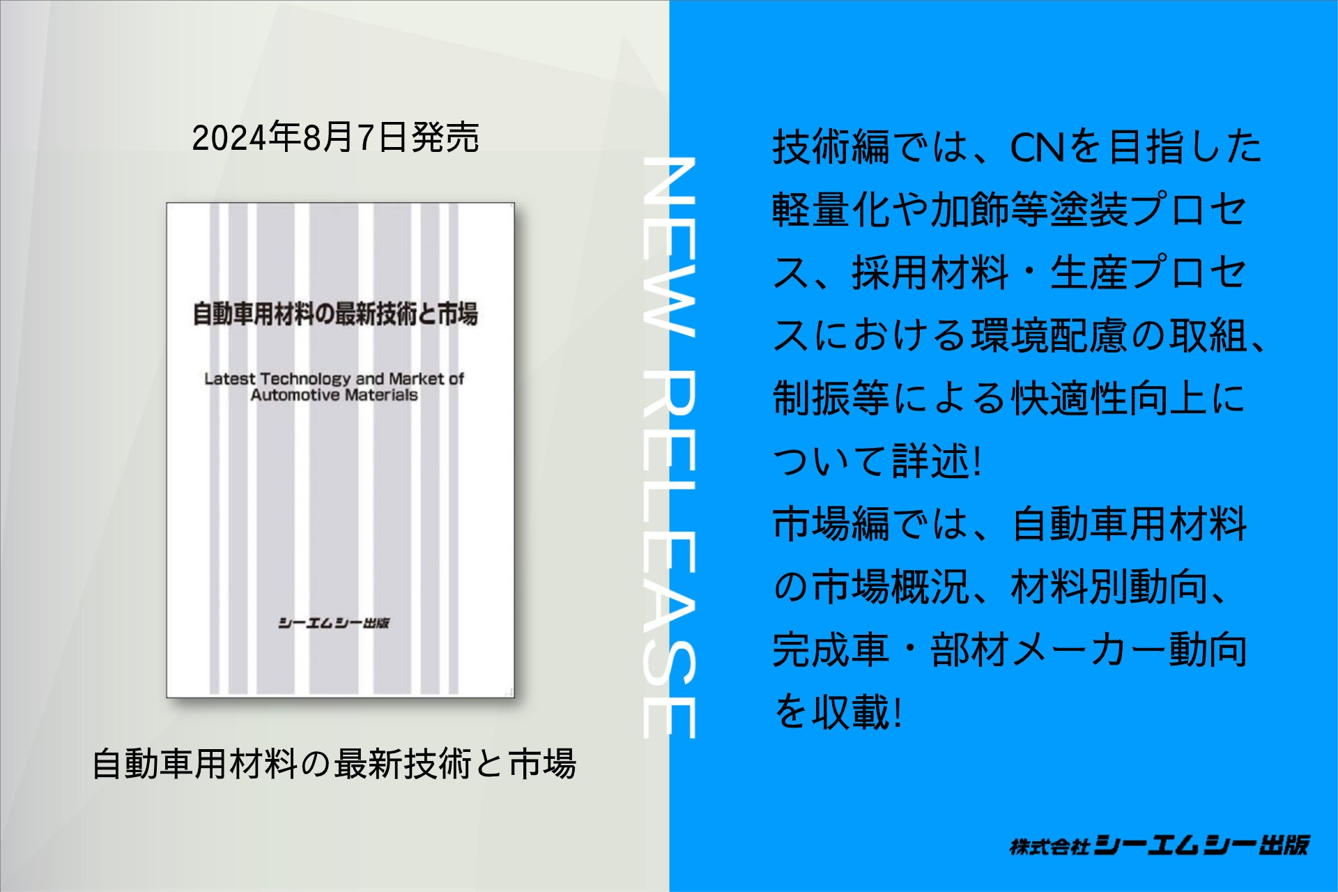 株式会社シーエムシー出版(本社:東京都千代田区神田錦町1-17-1、代表取締役:辻賢司)は、自動車車体や内外装を中心とした自動車用材料の最新技術/知見および市場動向をまとめた書籍『自動車用材料の最新技術と市場』(定価:税込93,500円)を、2024年8月7日に発売いたします。本書籍は、当社ECサイトおよび全国の書店にてご購入いただけます。