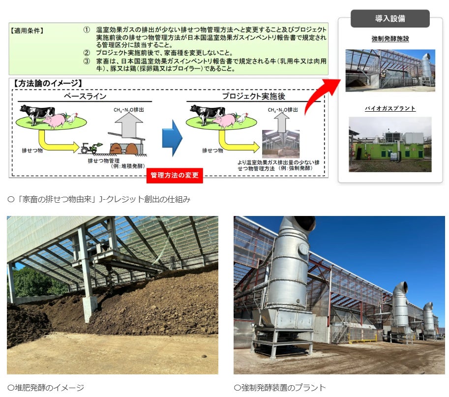 本取組みで使用するJ-クレジットの方法論は、「家畜排せつ物管理方法の変更(AG-002)」で、鶏・豚・牛の家畜の排せつ物の強制発酵設備を導入する事により発酵の速度を上昇させ、発酵の過程で発生するメタン(CH4)や一酸化二窒素(N2O)を削減し、削減分をJ-クレジットとして認証させる仕組みです。