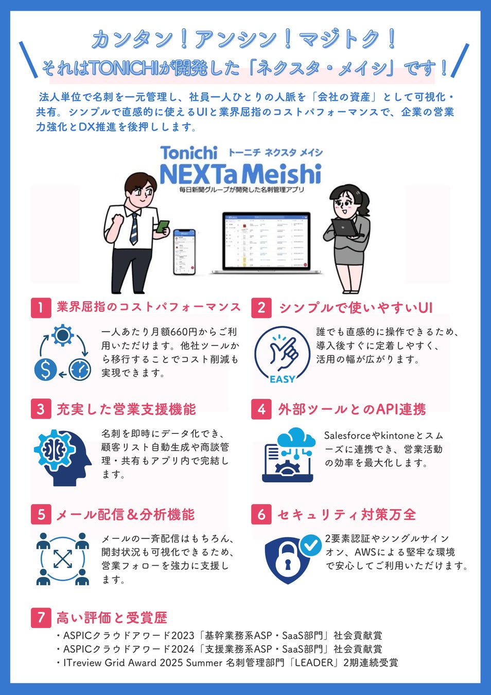法人向け名刺管理アプリ「ネクスタ・メイシ」を開発・販売する東日印刷株式会社(本社:東京都江東区、社長:西川光昭、以下 TONICHI)は10月1日、アナログ名刺管理の「苦労あるある」をコント風にお届けするYouTubeアニメを公開しました。「これ、うちかも、、」と笑うに笑えない方が、きっといらっしゃるはず。TONICHIコーポレートサイトから、ぜひご覧ください!