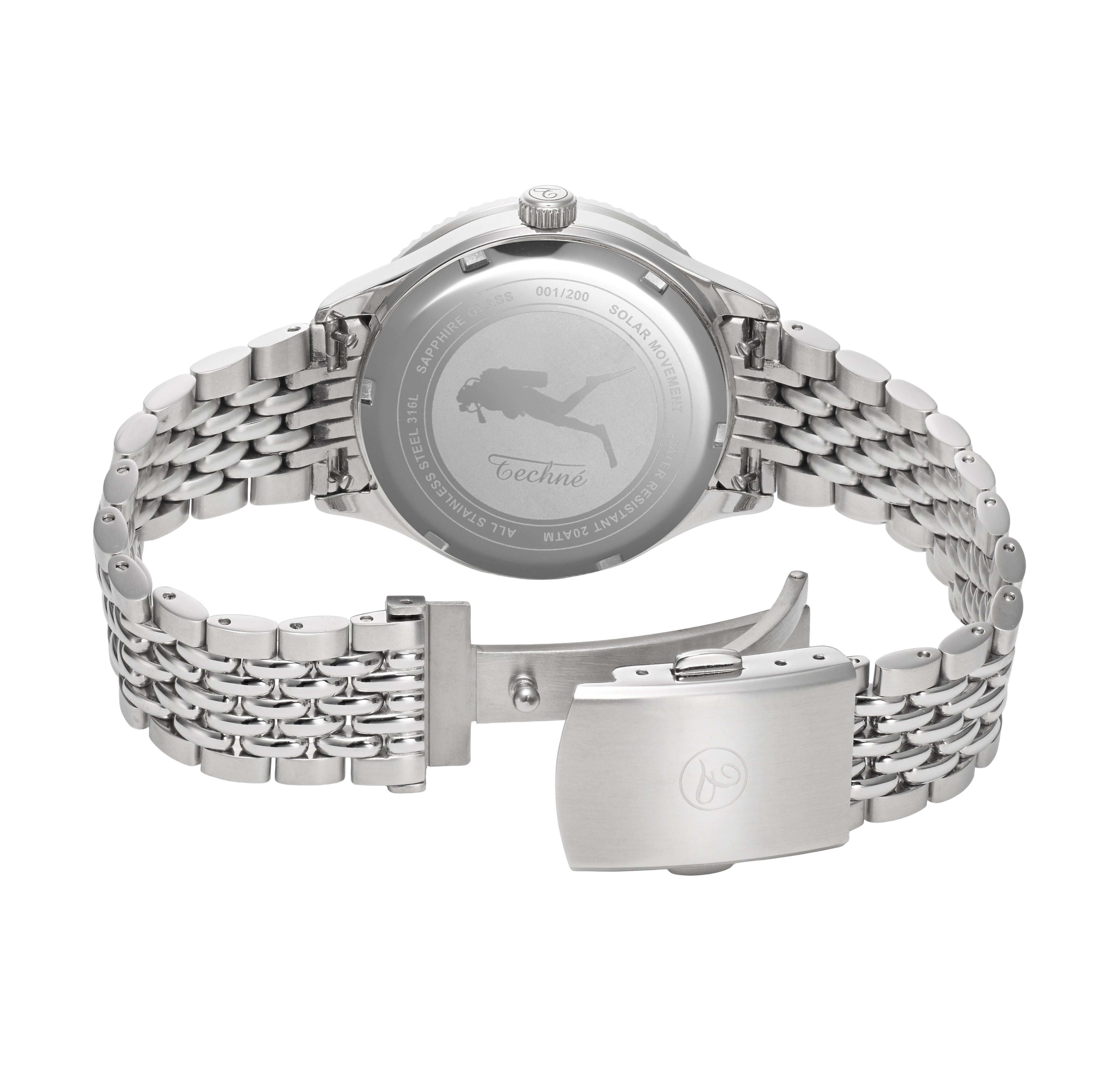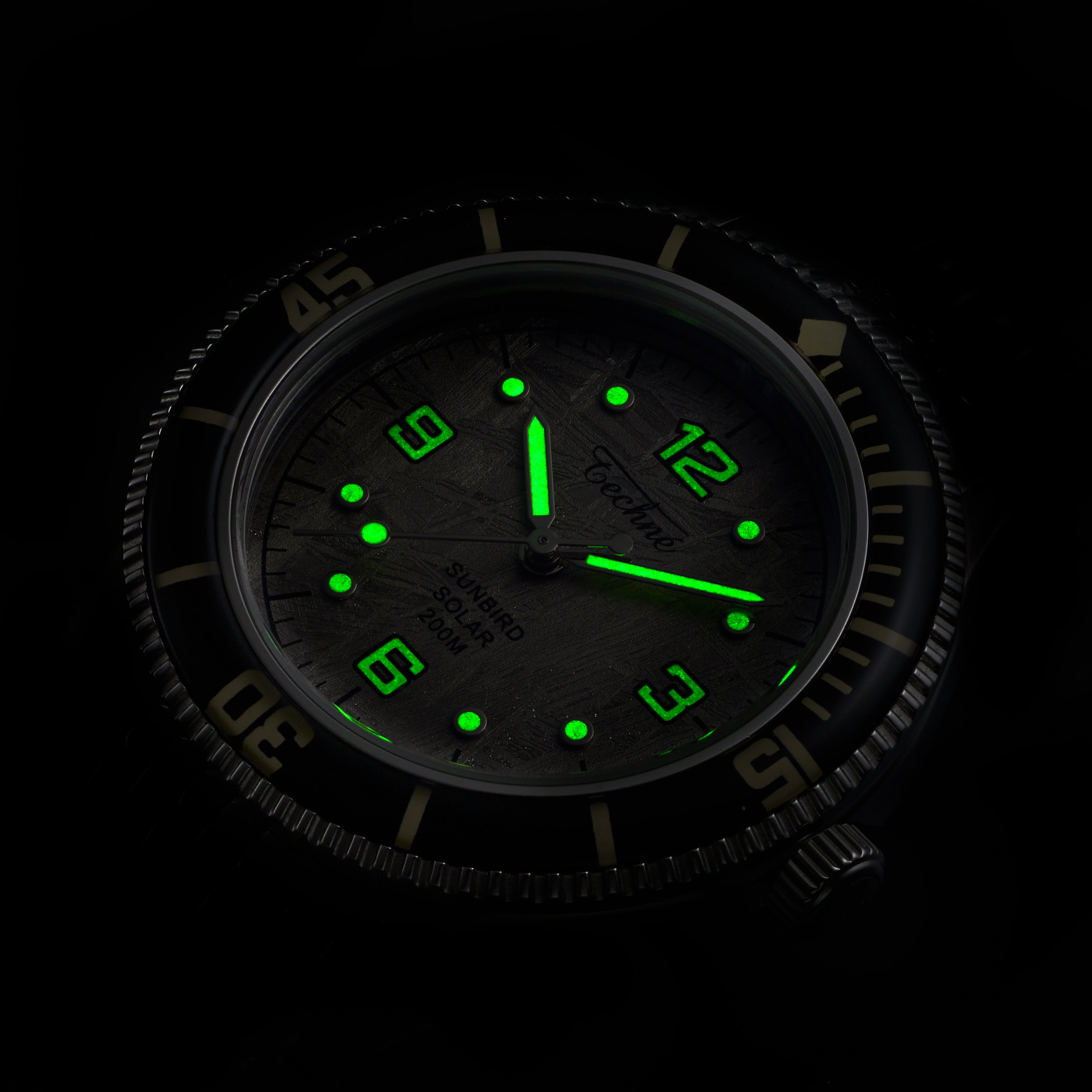 メテオライトは、数億年という悠久の時を経て地球に到達した天然素材。内部に現れるウィドマンシュテッテン構造と呼ばれる結晶模様は、ひとつとして同じものが存在しない、まさに唯一無二の存在です。この結晶構造は地球上では再現不可能とされ、“本物のメテオライトである証”として知られています。Techneはこの神秘的な素材に着目し、ツールウォッチとしての実用性とロマンを兼ね備えたダイバーズウォッチへと昇華。今回、そのメテオライトに新たな2つの色彩表現を加えました。