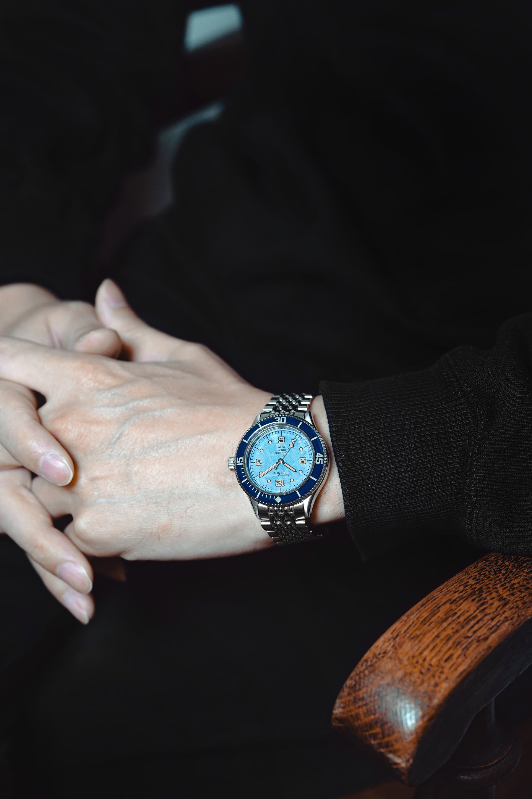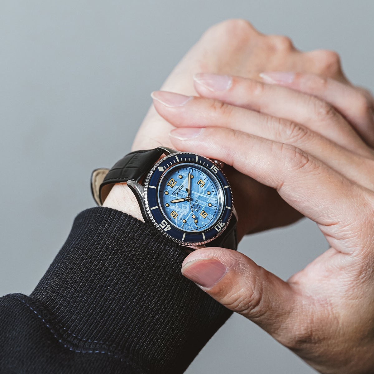 ネイビーモデルは、深海を思わせる落ち着いた色調の中に、メテオライト特有の結晶模様が静かに浮かび上がる仕上がり。ヴィンテージダイバーズの重厚感と、宇宙素材ならではのロマンが融合した、知的で洗練された一本です。
