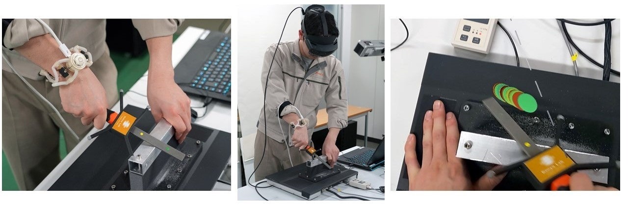 東北大学は、作業者が手で感じる振動体感を、手先から手首に伝わる振動波形を手首に装着した腕輪型デバイスで計測し、触覚の知覚量に基づく信号処理技術を用いることにより、作業者が感じる触覚の知覚量を数値化し、AR(Augmented Reality)システムを介して空間に投影することで、作業体感の可視化に成功しました。