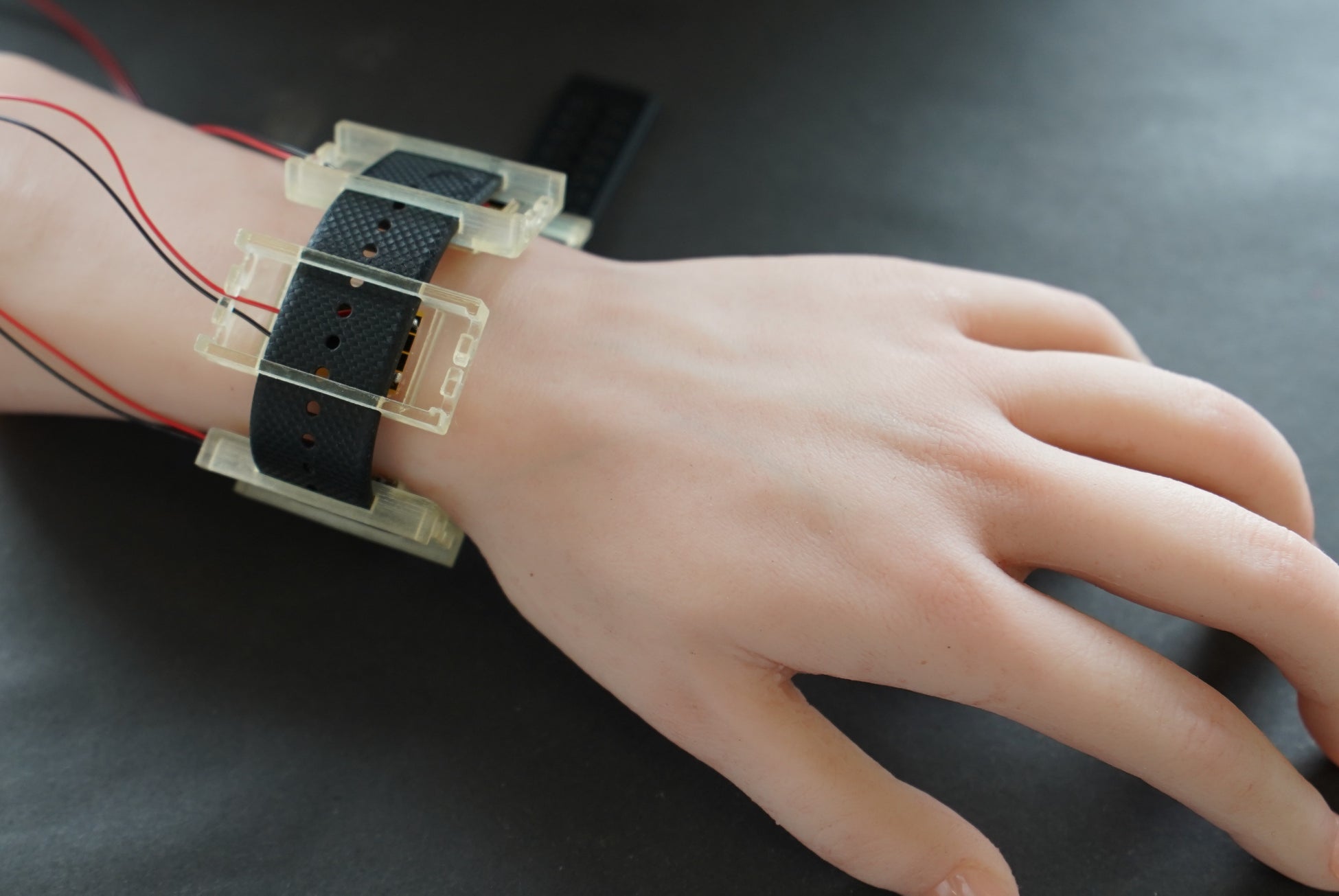 触覚デバイスと触覚信号編集技術を組み合わせることで、幅広い周波数帯域の触覚信号を体験できるため、指先で触れる操作や握手などの触覚情報を手首で計測し、相手側に伝えられるシステムです。