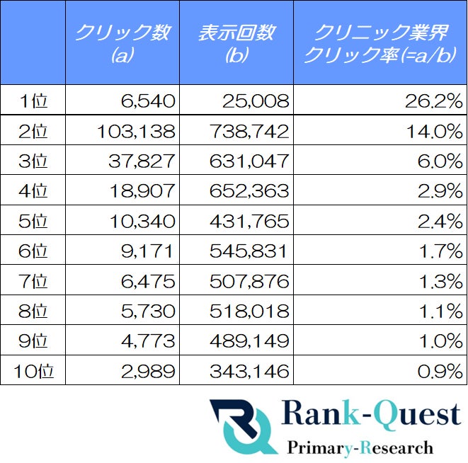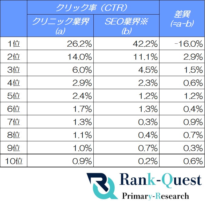クリニックサイトのSEO必須データ:検索順位別のクリック率(CTR)を徹底解析!(5月度:SEO会社ランクエスト調べ)