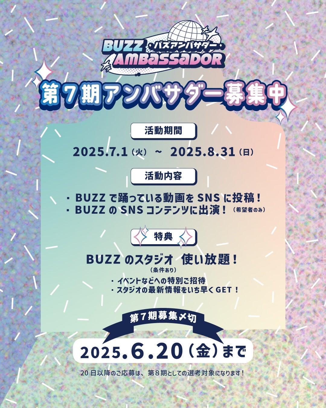 ・SNS投稿には必ず指定のハッシュタグ「#BUZZアンバサダー」「#スタジオBUZZ」を付けていただきます。