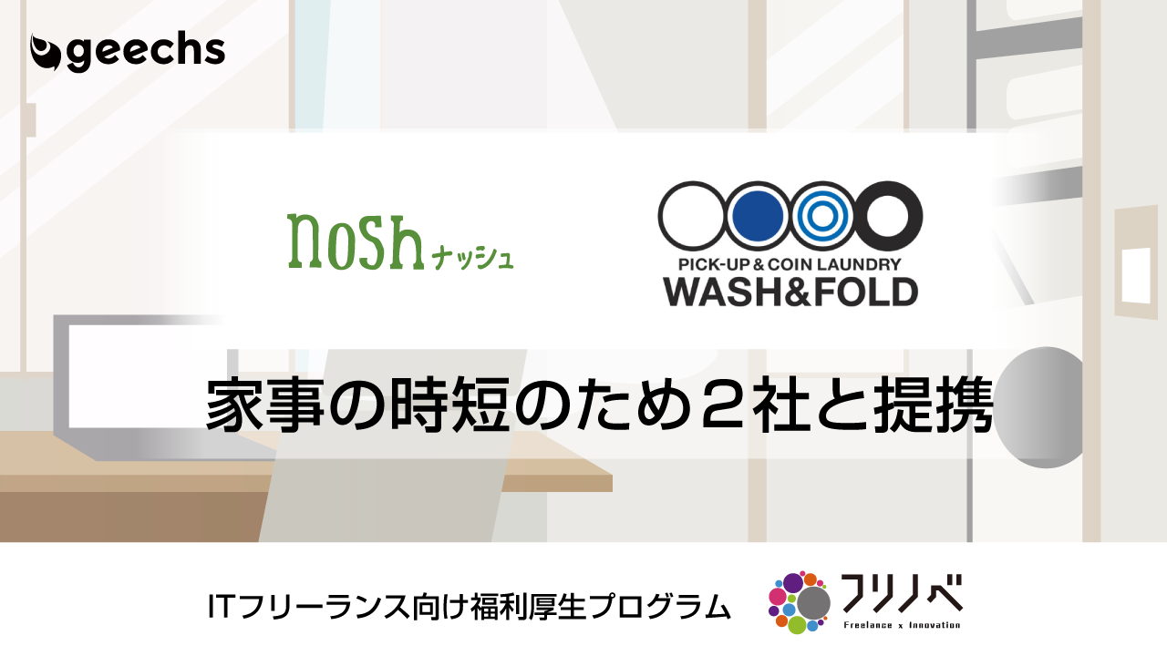 ギークス株式会社(本社:東京都渋谷区、代表取締役CEO:曽根原 稔人、以下ギークス)は、ITフリーランスの家事の時短をサポートするために、ヘルシー・糖質に配慮した食事宅配サイト「nosh-ナッシュ」を運営するナッシュ株式会社(本社:大阪府大阪市北区、代表取締役 社長:田中智也、以下ナッシュ)、洗濯代行+コインランドリー+クリーニング「WASH&FOLD」を運営する株式会社アピッシュ(本社:東京都渋谷区、代表取締役:山崎美香、以下アピッシュ)の2社と提携したことをお知らせします。