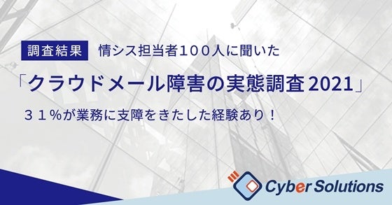 法人向けソフトウェアの開発、販売を行うサイバーソリューションズ株式会社(所在地:東京都港区、代表取締役社長:秋田健太郎、以下当社)は、2021年12月に全国従業員数300人以上の企業の情報システム担当者100名を対象とした、「クラウドメール障害時の実態調査」を実施しました。