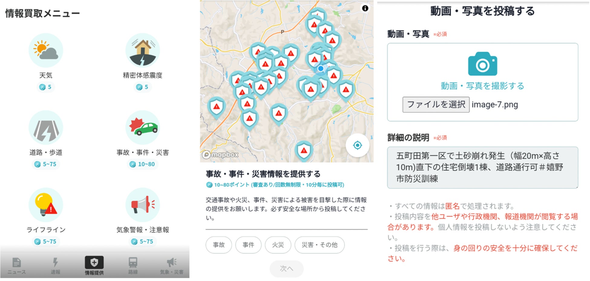 「NewsDigest(ニュースダイジェスト)」は、報道価値の高いニュースをAIで速報提供するニュースアプリです。NewsDigestの特徴のひとつに、身の回りのリスク情報を投稿することのできる『情報提供機能』があります。NewsDigestから投稿された情報やTwitter等のSNSに投稿された情報は、デマ情報をAIで自動的に排除する仕組みを有するAI危険情報リアルタイム配信サービス「FASTALERT」で解析された後、NewsDigestでリアルタイムに閲覧することができます。