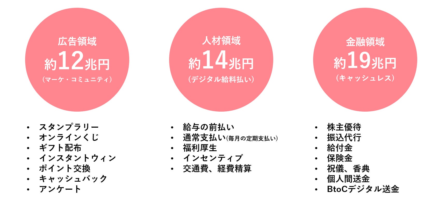 マーケティング(広告)領域・人材領域・支払いのDX(金融)領域の3つの領域を注力領域としてあげ、3万円以下のtoC向け支払いでのシェア拡大を目指し邁進しております。