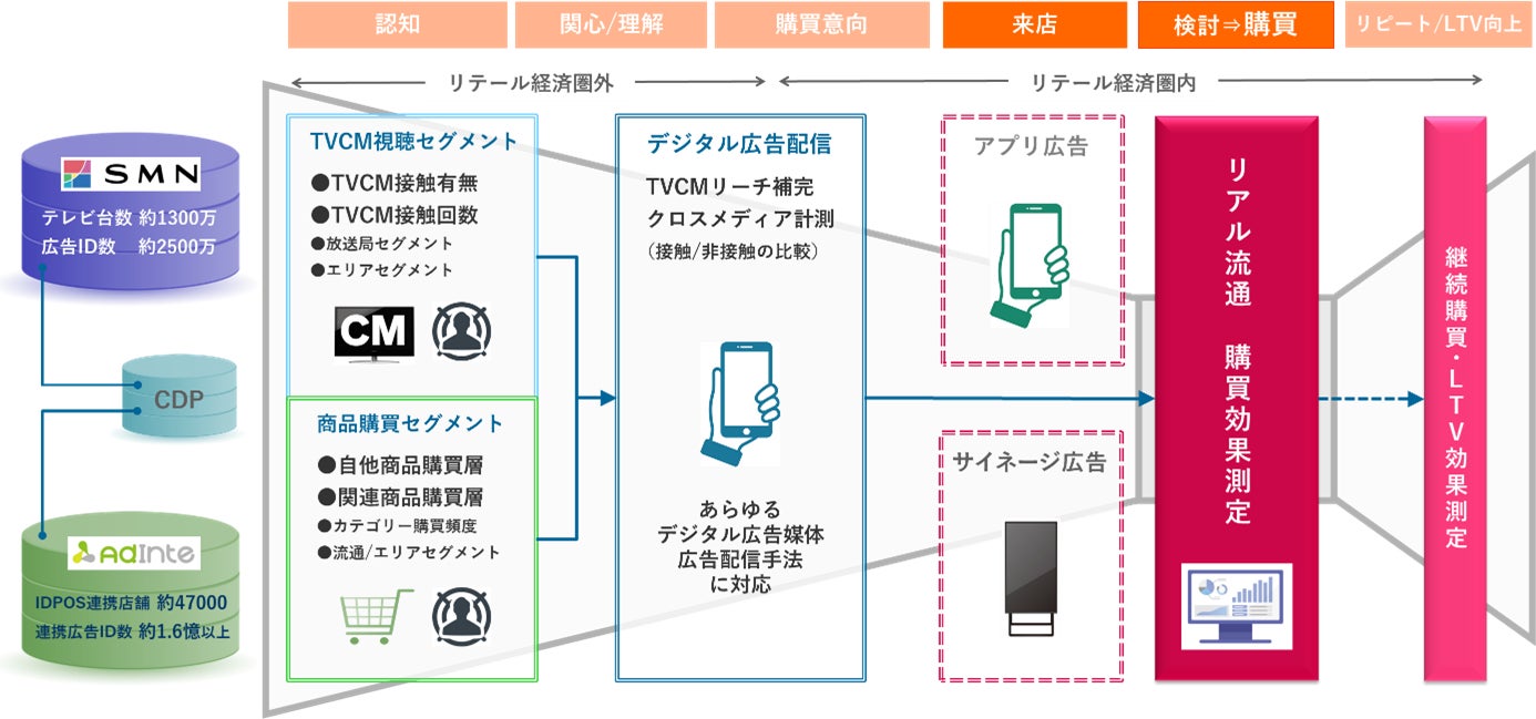 アドインテはこれまで、リテールメディア開発・運用をもって、流通小売企業の購買データを活用したデジタル広告や小売アプリ内広告・店内サイネージ広告の購買計測・効果可視化モデルを構築してきましたが、今回SMNと協業することで、アドインテが活用可能な業界最大規模 約1.6億の購買IDとSMNが提供する「TVBridge」の業界最大規模 約1,300万台のコネクテッドテレビのテレビ視聴データに由来する視聴識別・広告ID、約2,500万IDのデータと連携し、TVCM視聴層/非視聴層への(リテールメディアを活用した)各種デジタル広告配信を実施、TVCMとデジタル広告をクロスした購買貢献分析を「テレデジ×リテールコネクト」というソリューションにて実現しました。