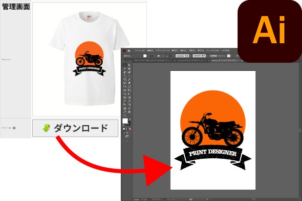 サイト訪問者が作成したデザインデータは、事業者がプリントデザイナーの管理画面からダウンロードできます。そのまま入稿データとして使えるので、デザインの修正や制作コストの手間が省けます。