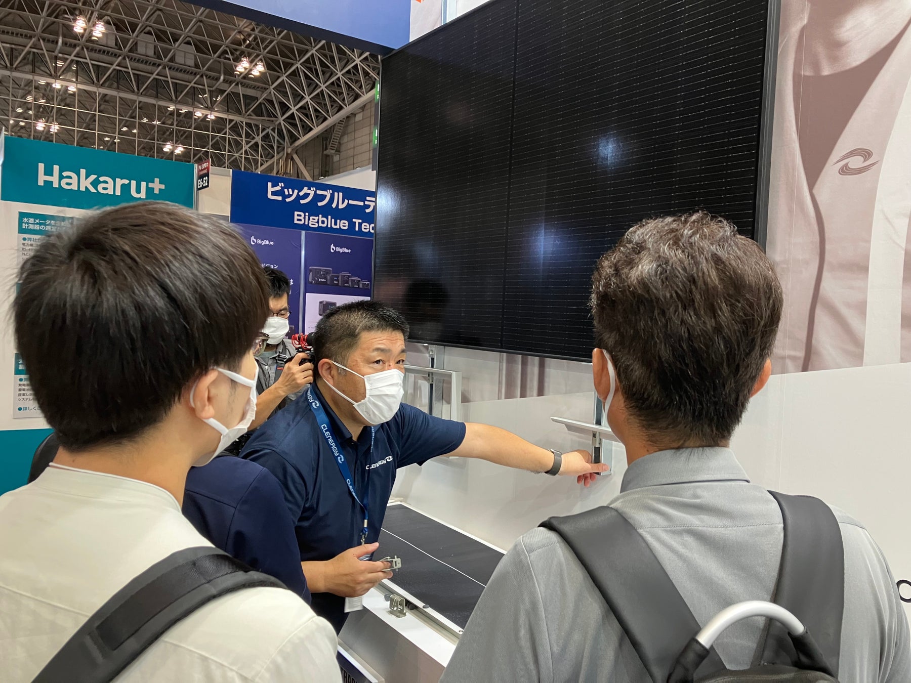 展示では、住宅やビルの外壁に直角にモジュールを設置可能な、CARTS PV ソリューションの壁設置ソリューションや、電気自転車用の電子駐輪場の上に設置可能なサイクルポートを展示いたしました。当日は、実際にソリューションが設置されている様子を近くで見ていただき、担当者がソリューションに関する質問に答えました。