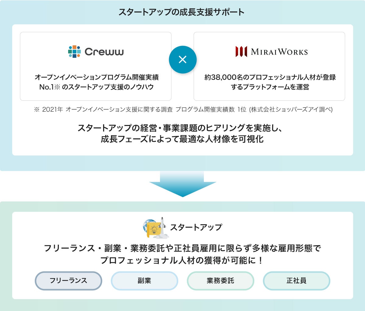 創業期のスタートアップにとって、限られた人材で急成長を目指すために人的資本は限られています。Crewwのスタートアップ支援のノウハウ・知見と、みらいワークスのプロフェッショナル人材ネットワークを連携することで、人材紹介だけに留まらずスタートアップの経営・事業課題のヒアリングを実施し、最適な人材像の可視化を実施することでスタートアップのフェーズによって必要な人材を、フリーランス・副業等の業務委託や正社員といった多様な雇用形態で支援する仕組みを作ることにより、成長支援に取り組んでまいります。本事業は、2022年6月を目処に提供開始を予定しております。