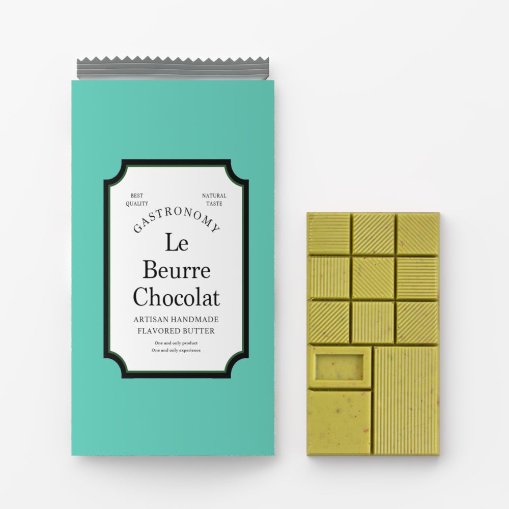 バニラリッチなホワイトチョコレートに、国産フレッシュバター、ローストピスタチオのペースト、スパイス(グリーンカルダモン)、刻んだローストナッツ(くるみ、カシューナッツ、アーモンド)を加えたオリジナルのバターチョコレートです。バターとチョコレートの口溶けの温度差を生かして、バターのように素早く溶けるチョコレートがピスタチオの香りを一層引き立てます。
