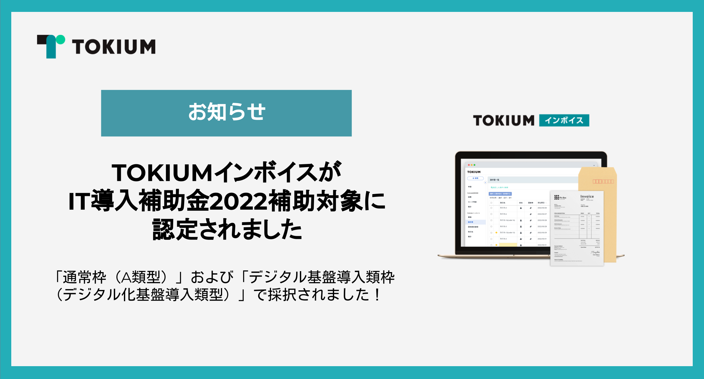 株式会社TOKIUM(本社:東京都千代⽥区、代表取締役:黒﨑賢一、以下「当社」)は、この度、経済産業省 中小企業庁が推進する「IT導入補助金2022」(以下、IT導入補助金)通常枠およびデジタル基盤導入類枠において「IT導入支援事業者」として認定され、当社の提供する請求書受領クラウド【TOKIUMインボイス】が対象ITツールとして採択されたことをお知らせいたします。