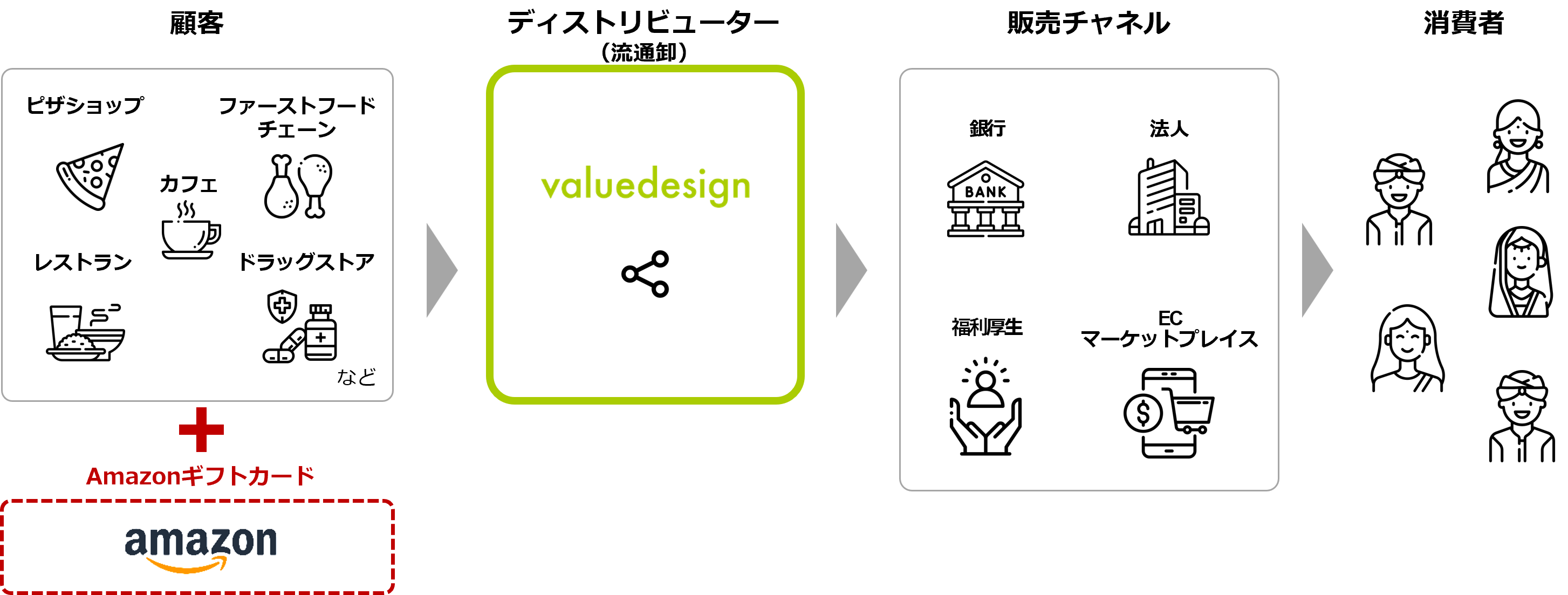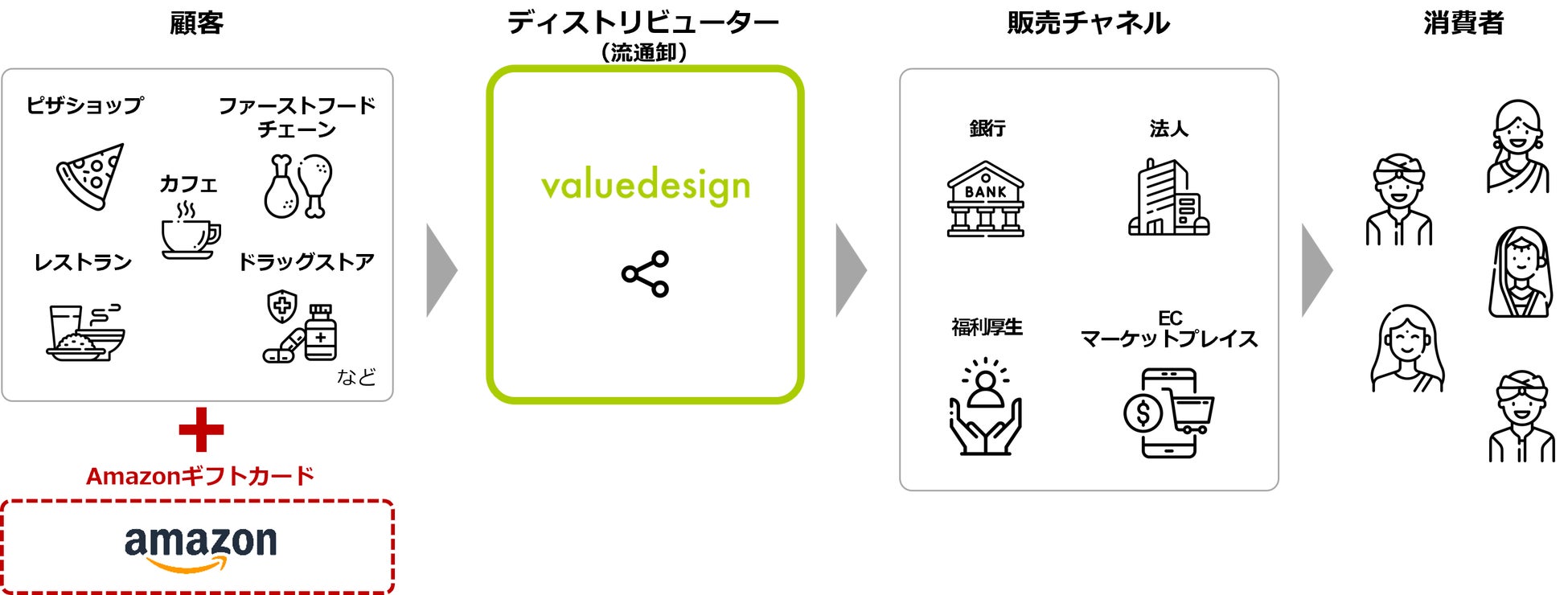 また、バリューデザインは、インド国内約5億人の消費者へリーチ可能な独自流通ネットワークを活用し、販売代理店として、企業などに対し、Amazon Pay eGift Card等を販売してまいります。